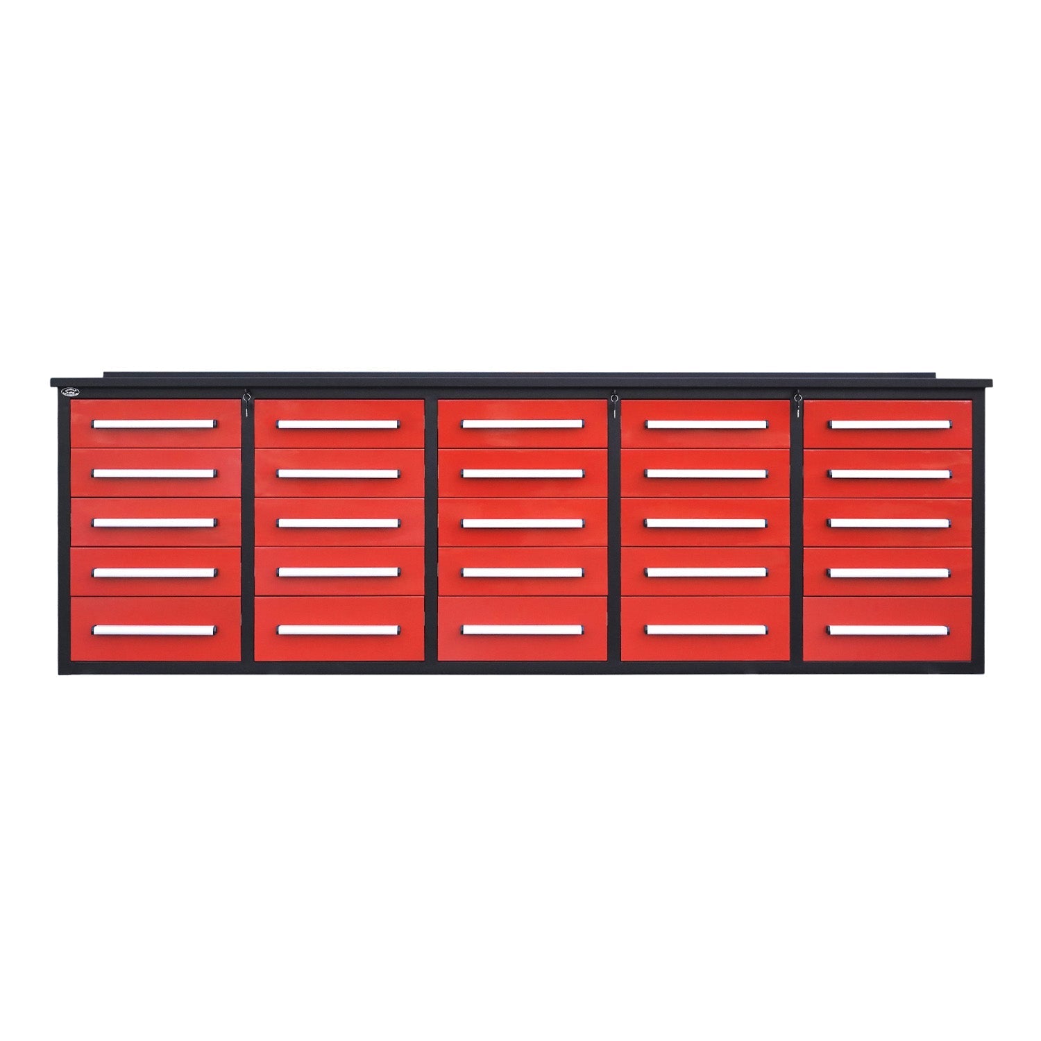 • 10ft heavy-duty workbench with 25 drawers offers maximum storage and workspace for industrial or professional use.