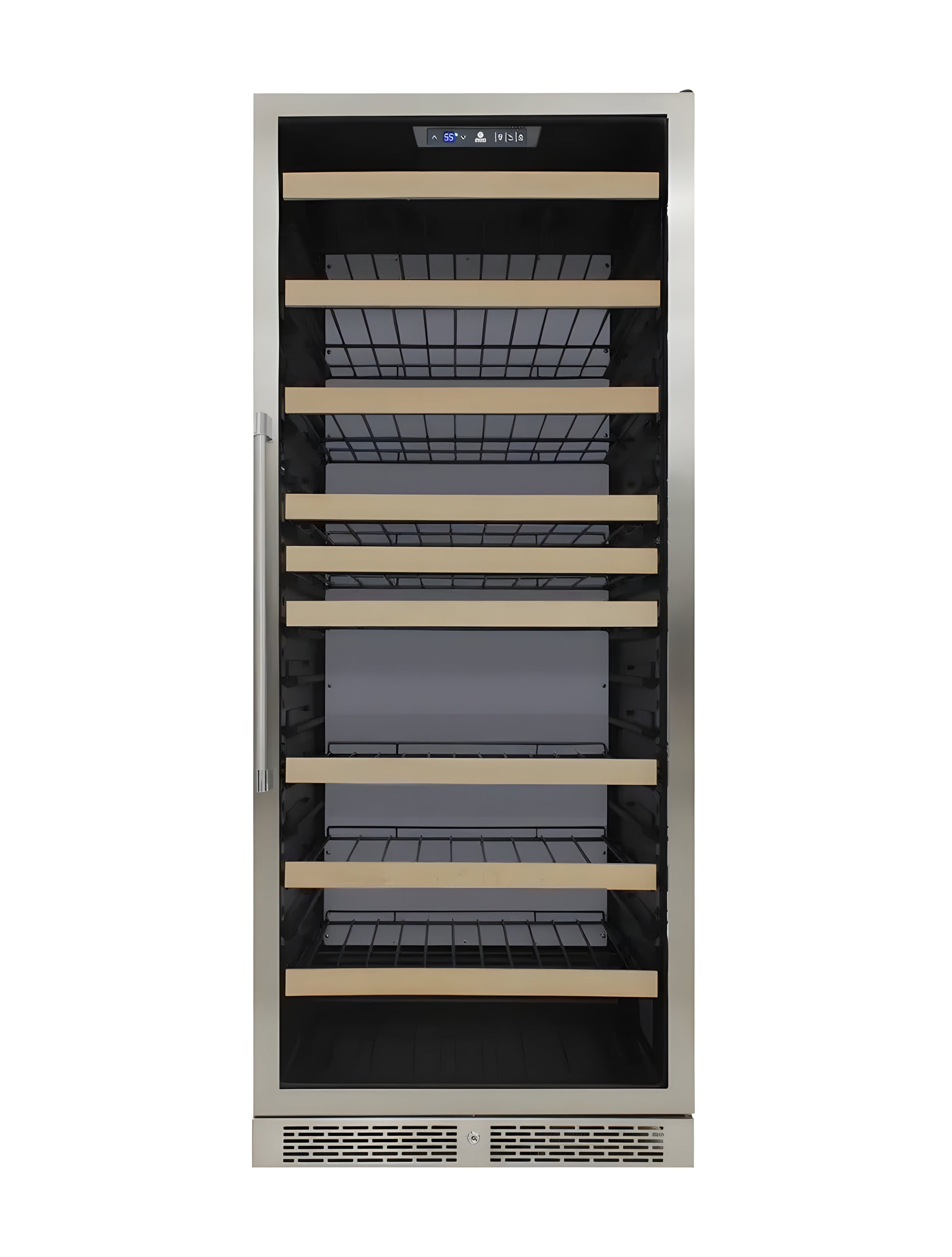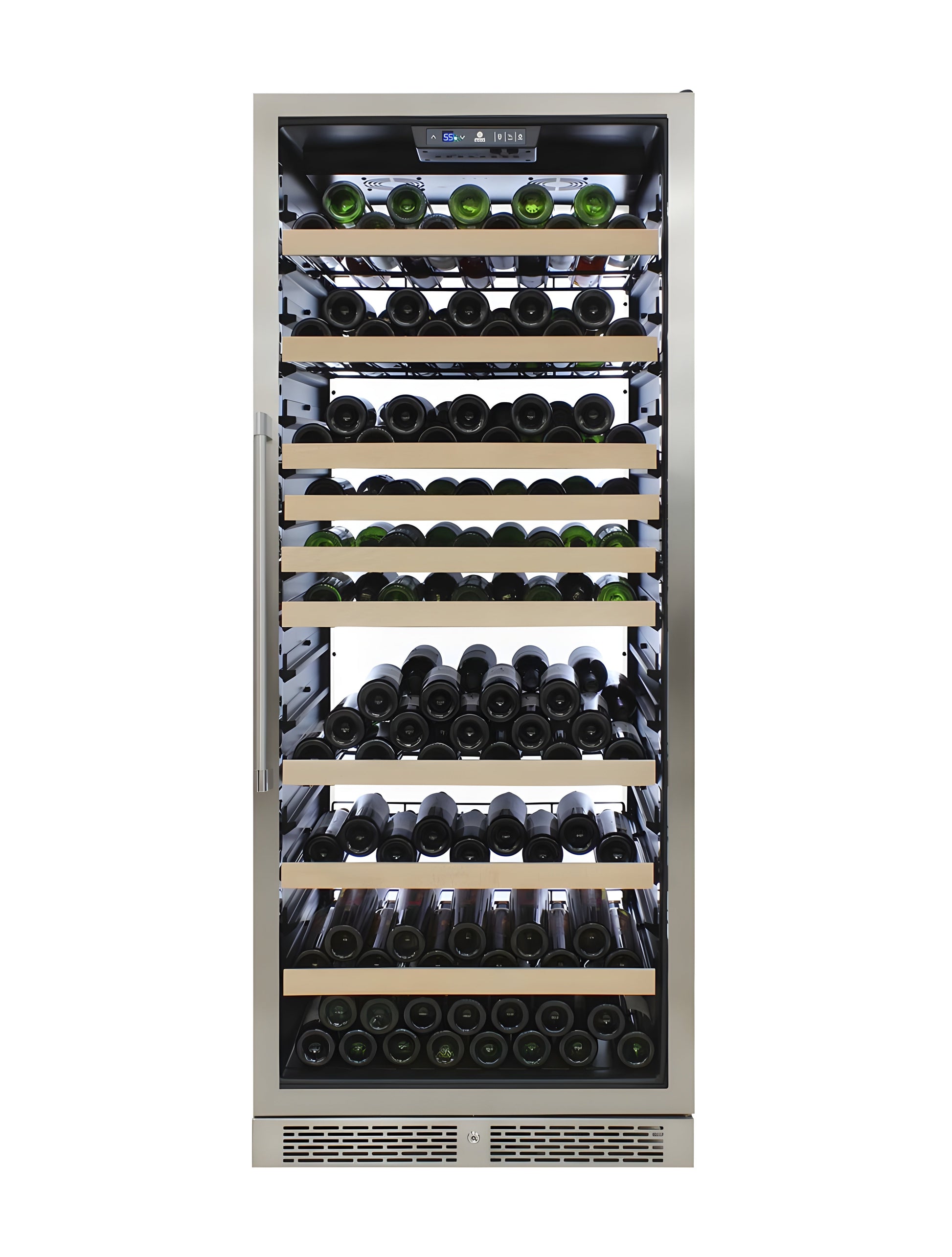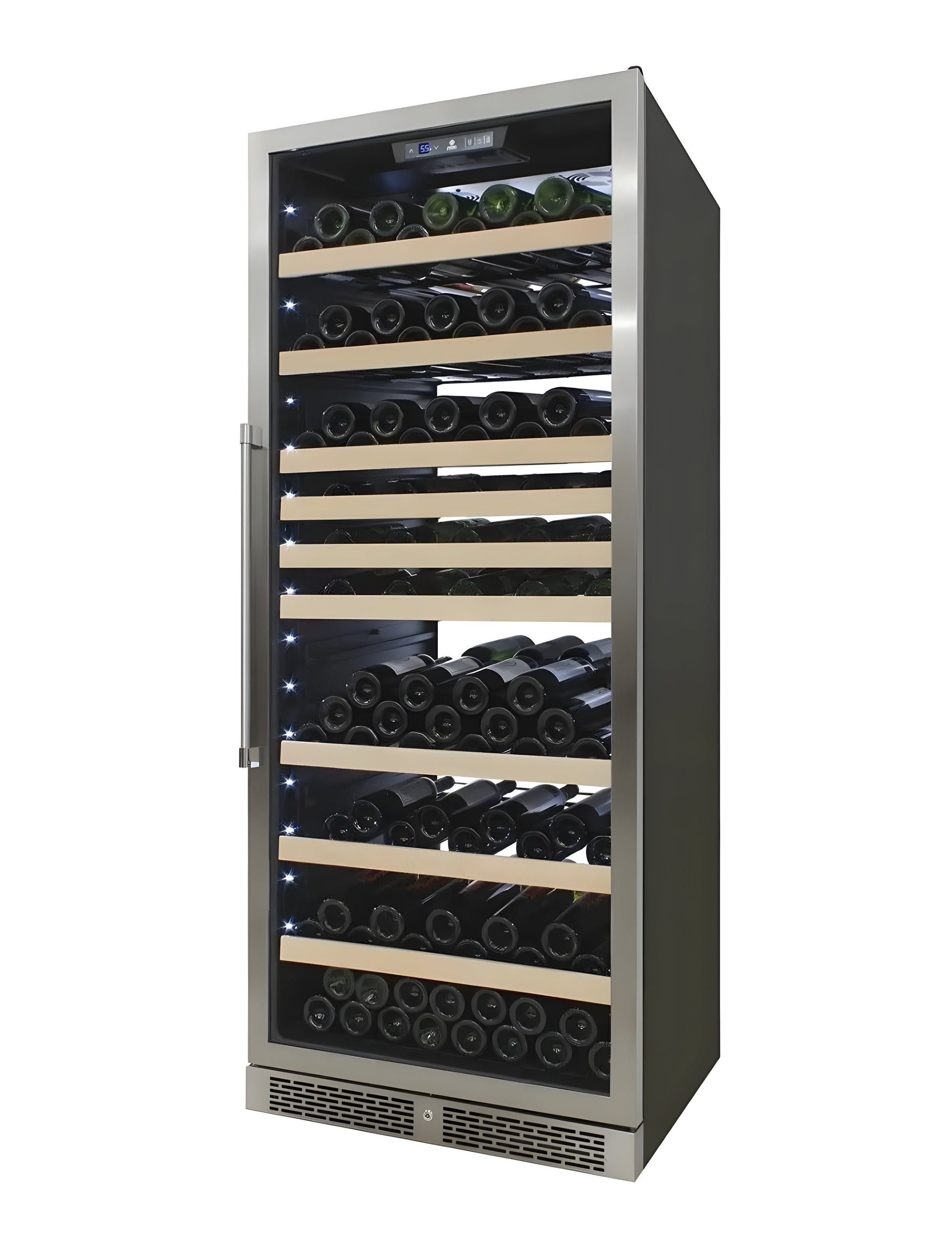 A: It’s a high-capacity, single-zone wine cooler designed for commercial and home use, featuring a sleek white backlit panel for a modern aesthetic.
