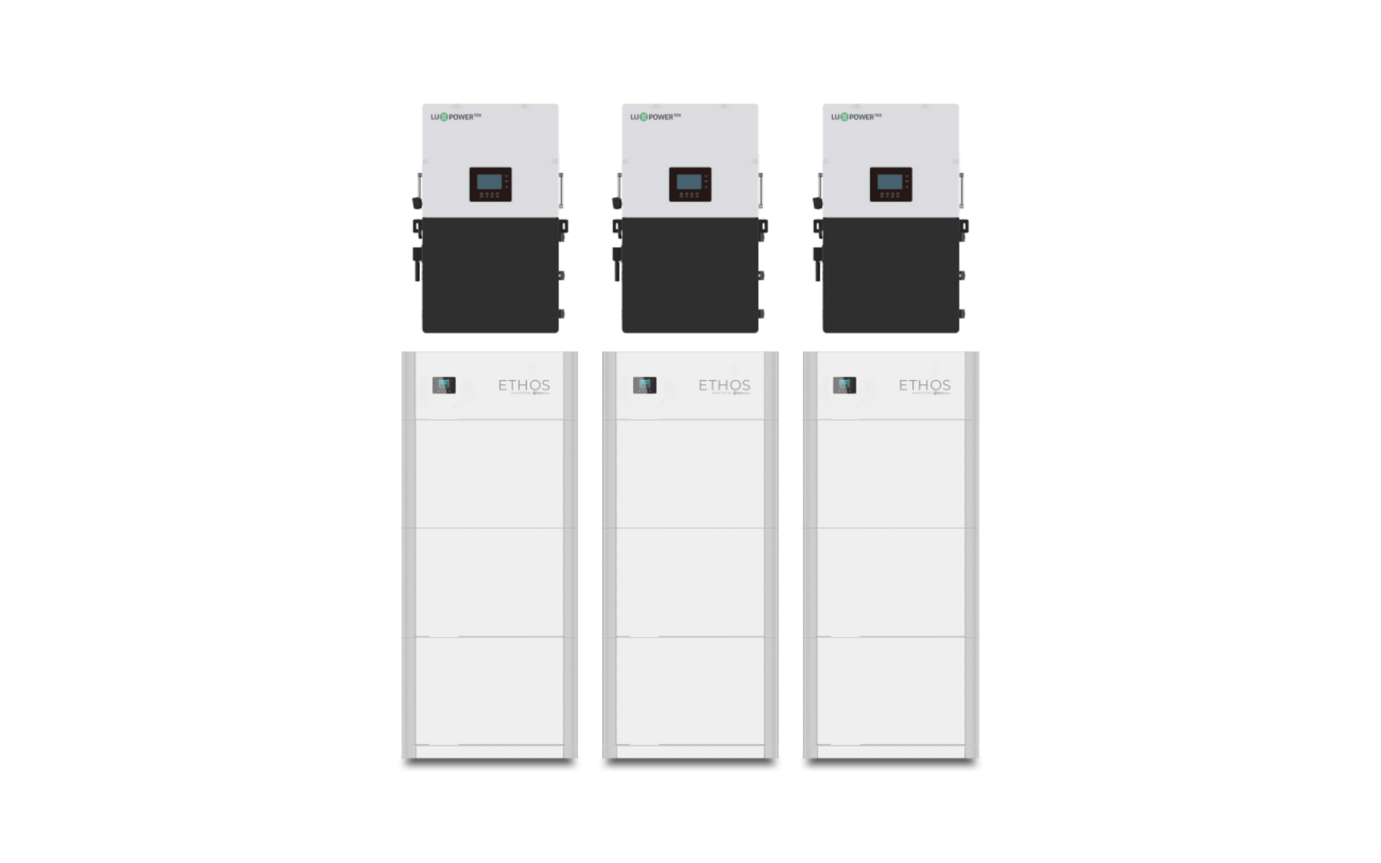 But that’s not all. We pair this ETHOS system with 3 cutting-edge 12000W Lux inverters, which feature their own LCD touch screen displays, 3 MPPT inputs each, integrated UPS modules for seamless on and off-grid switching, and the ability to handle PV arrays of up to 54000W. Plus, through their smart load control, AC coupling abilities, and peak shaving functions, you can meet your power needs and protect your business against unstable grids or rolling blackouts, while seeing huge savings each month on your electric bill.