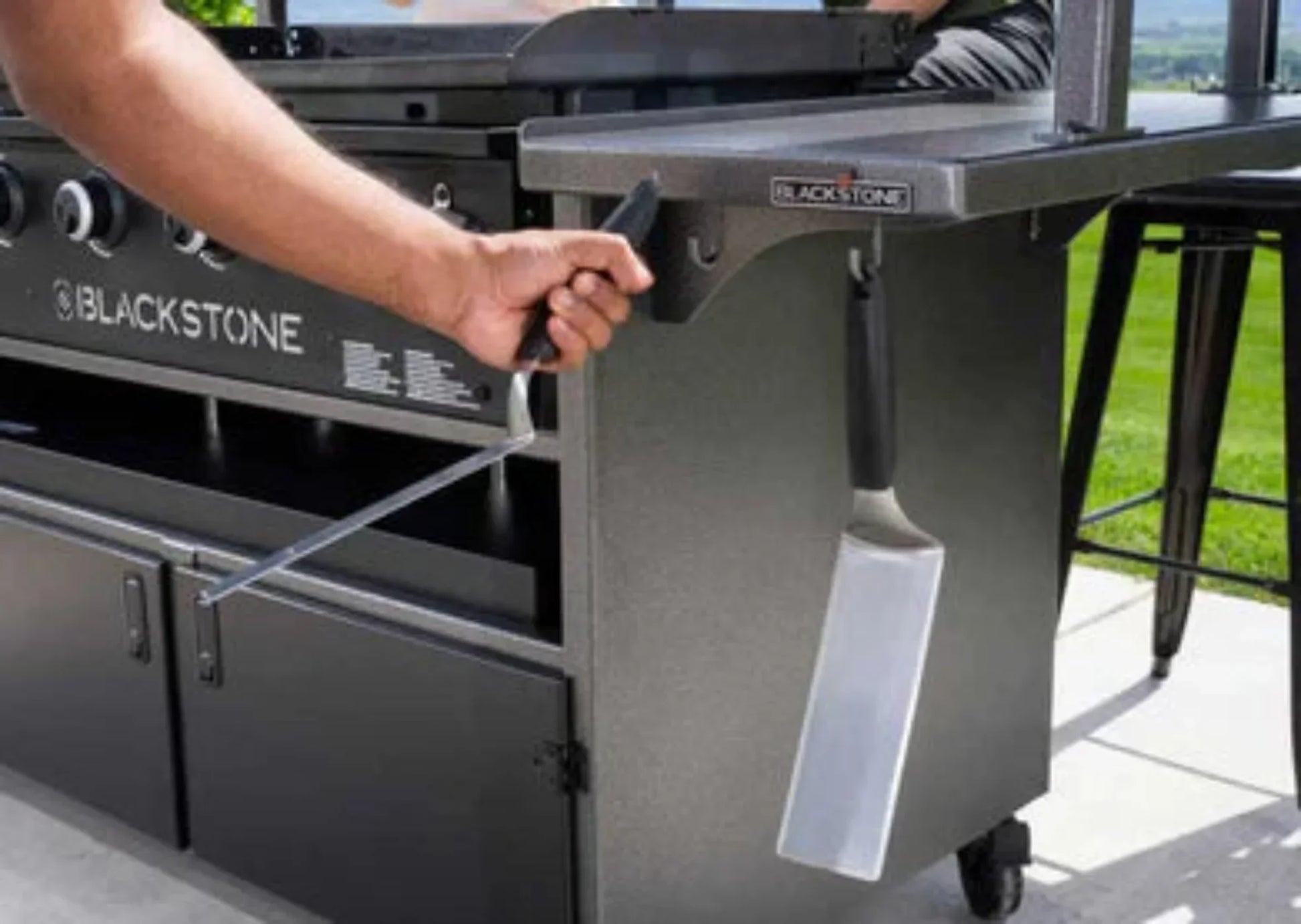 A: Yes, it provides ample storage for tools, propane tanks, and other cooking accessories beneath the griddle surface.