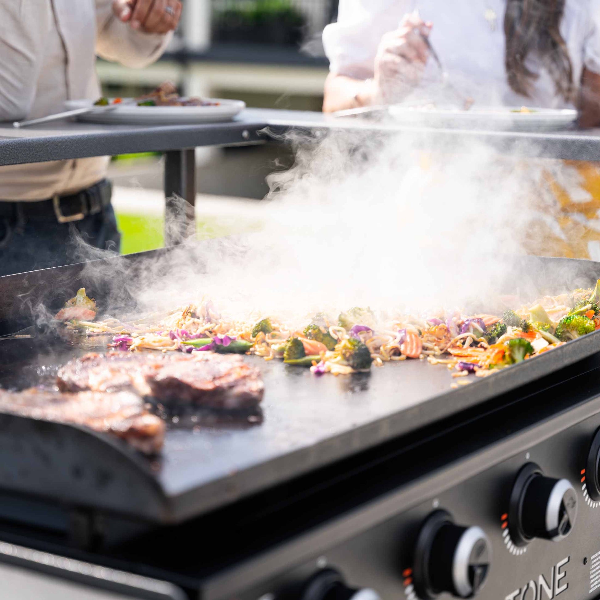 A: The Blackstone Chef's Table includes a built-in 36" griddle and seating for 5 people, perfect for interactive cooking experiences.