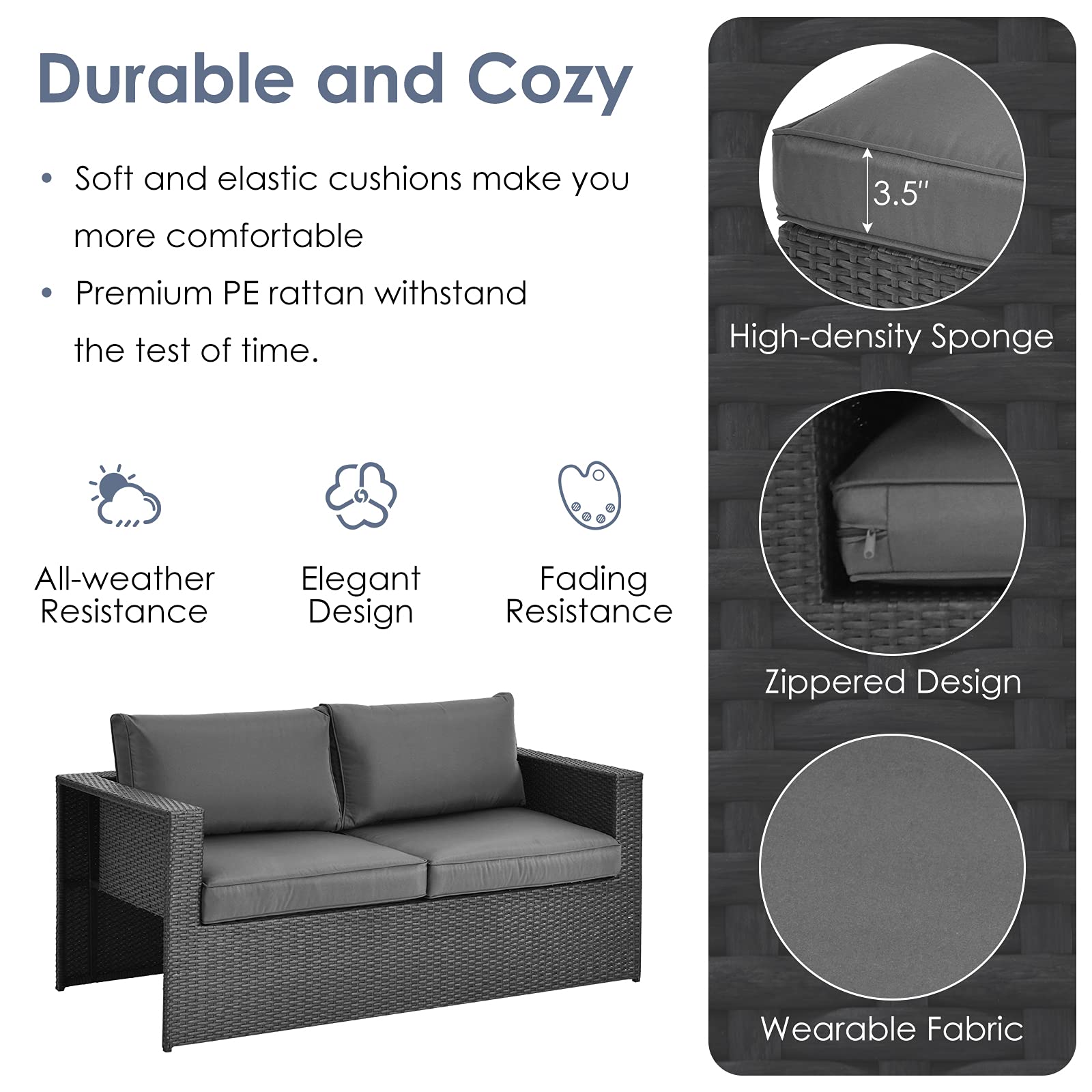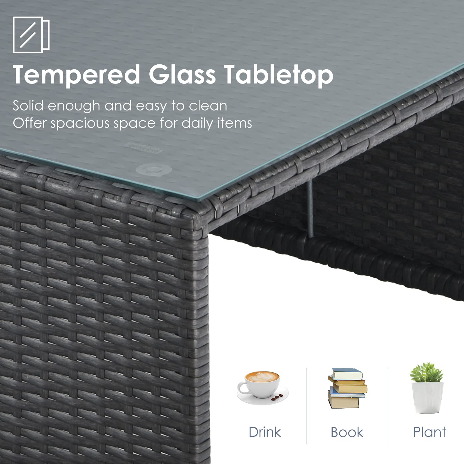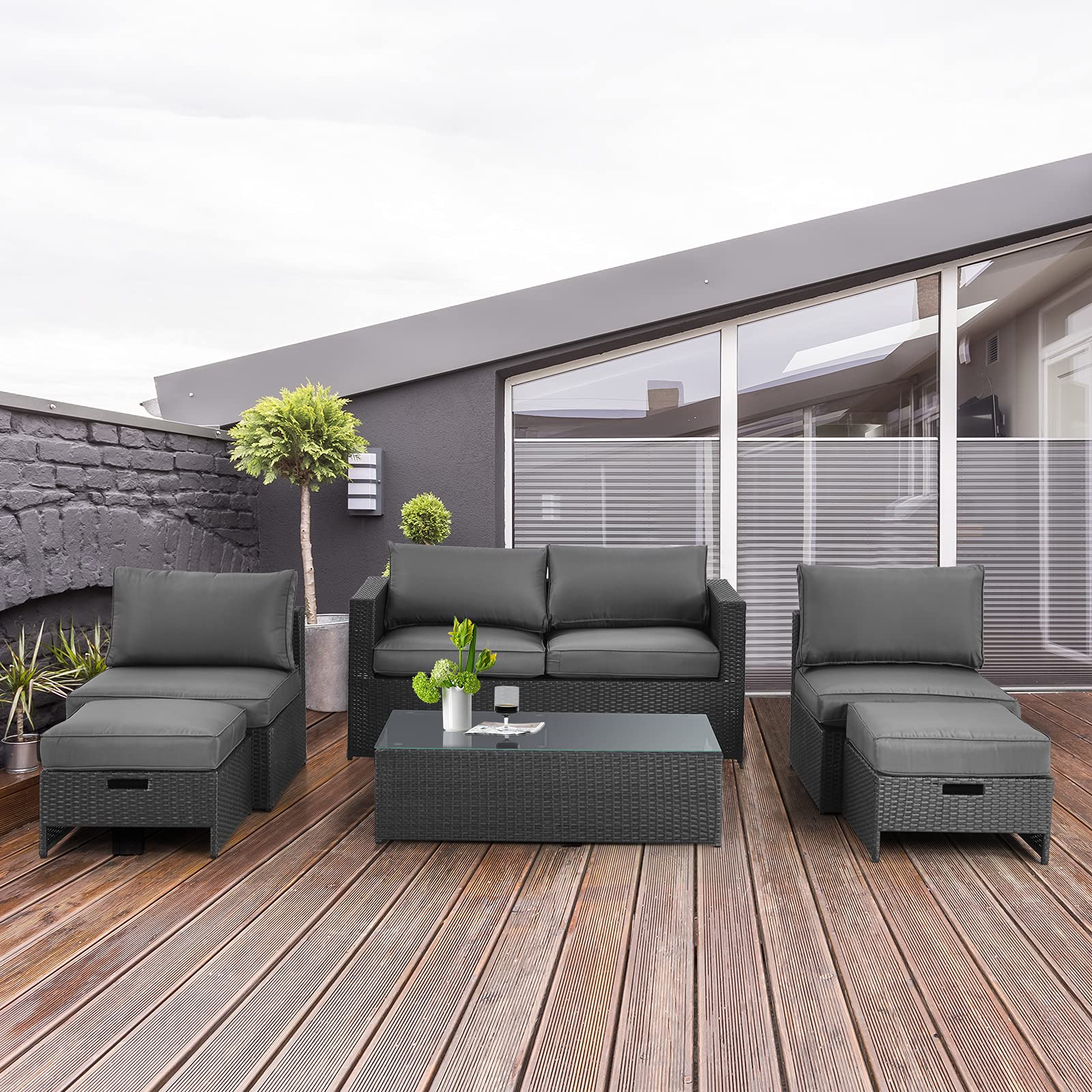 Our 6pcs patio furniture set provides a perfect outdoor relaxing place for you. It features 1 loveseat, 2 side chairs, 2 ottomans, and 1 coffee table, allowing you to combine all the pieces freely and satisfy all your outdoor relaxing needs. And the patio set is exactly perfect for outdoor use, as the rattan is all-weather resistant and the steel frame is anti-rust and sturdy enough. Other than that, the cover of the cushions is proof against splashing water so you don't have to worry about spilling liquids. But you need to move all the cushions away when it rains. When not used, all the pieces can be organized into a whole, which takes much less space for storage.