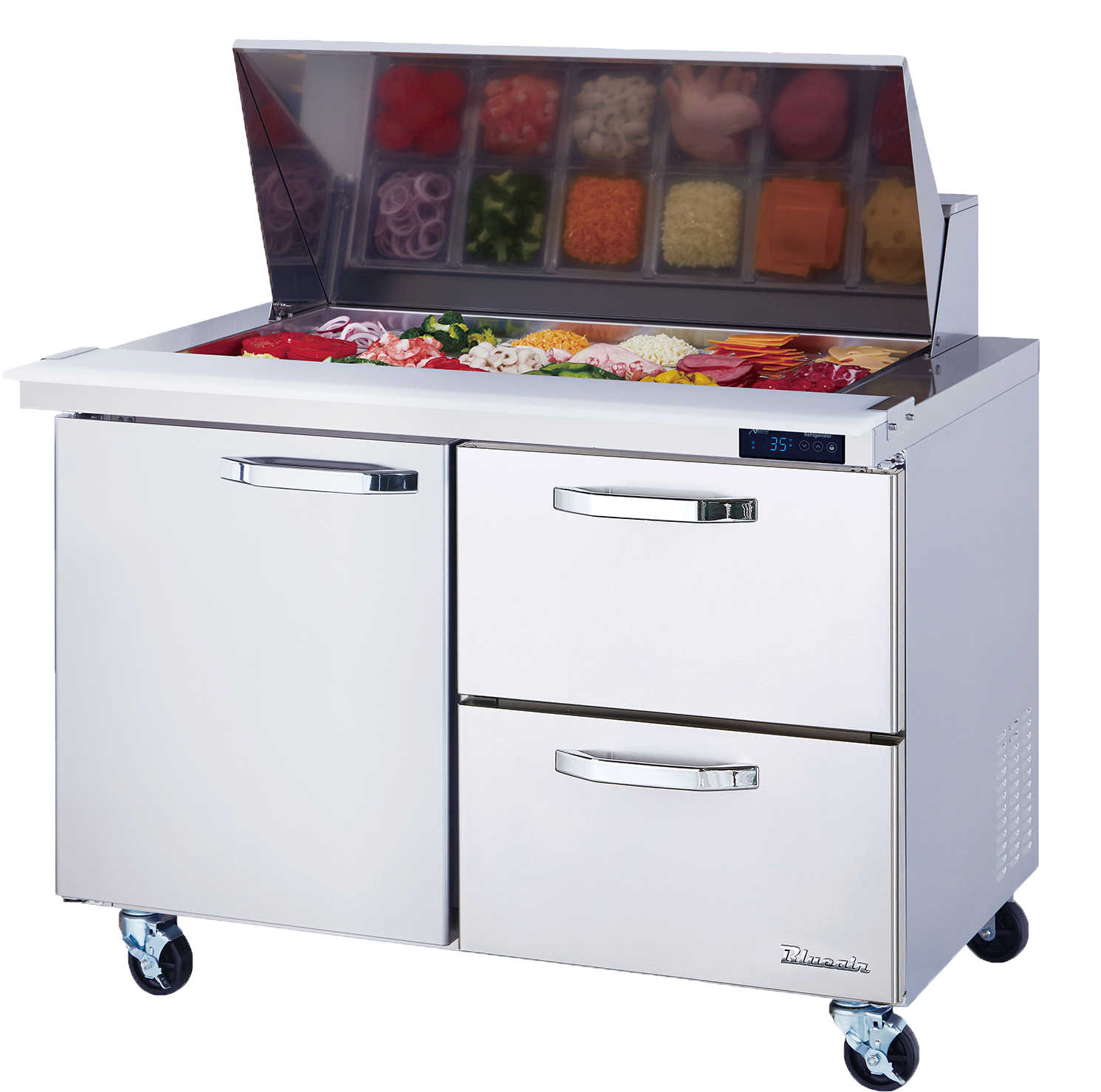 Mega top design provides extra prep surface for efficient sandwich preparation.