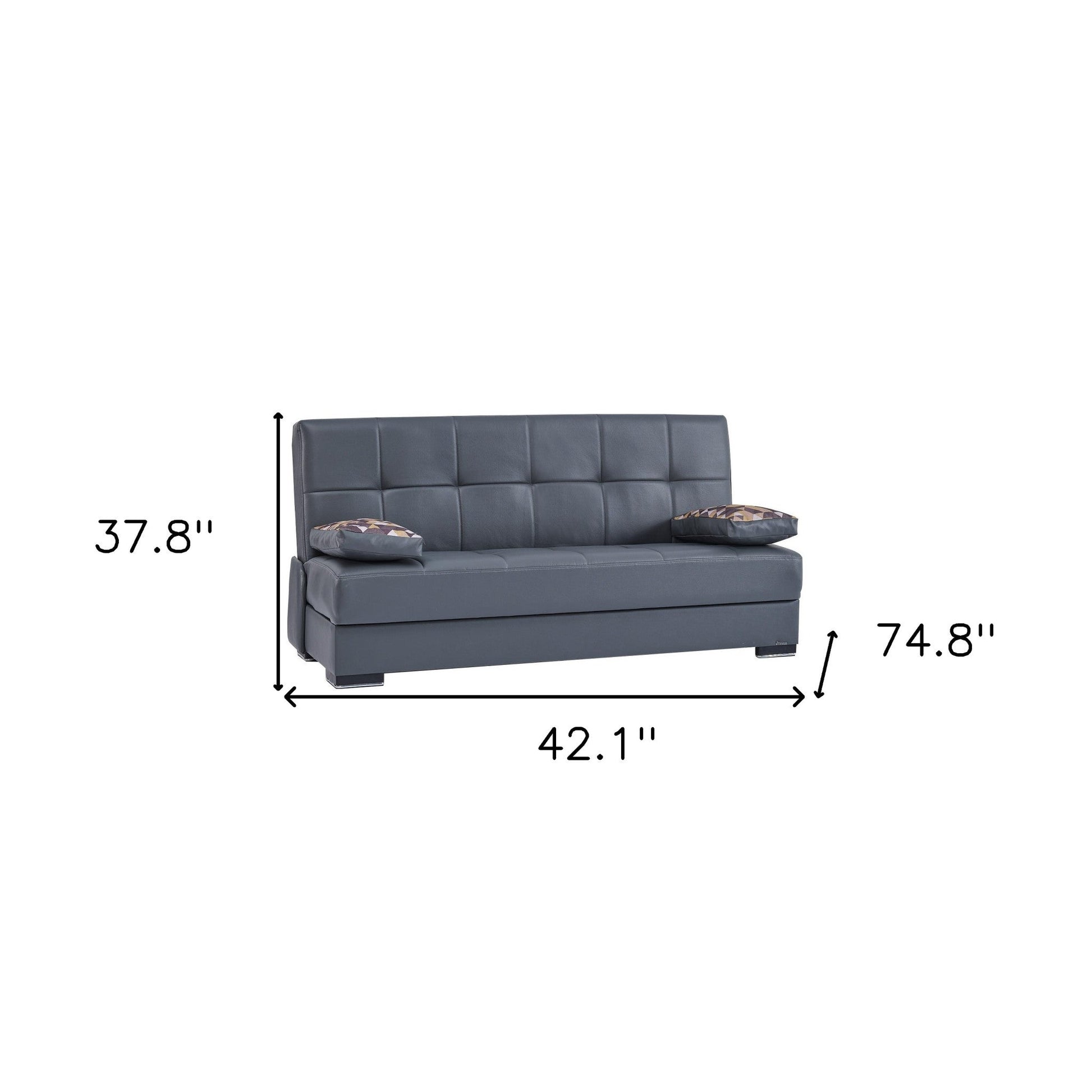 With a look and feel like leather, this 75-inch gray faux leather convertible futon sleeper sofa and toss pillows with brown legs is made from sturdy and resilient faux leather to stand up to the test of time. Solid colors give you lots of decorative options and are easy to work into your decor scheme. Sinuous springs construction gives this piece strong support and makes it comfortable to sit even for long periods of time. Removable arms offer a comfy place to rest. Designed with an updated and refreshing style, this sofa is armless to create that unique contemporary or modern aesthetic. The tufted stitching pattern adds visual interest and fine designer detailing. A great showpiece for your room, this sofa is a must have. 37.8-inch H x 74.8-inch W x 42.1-inch D