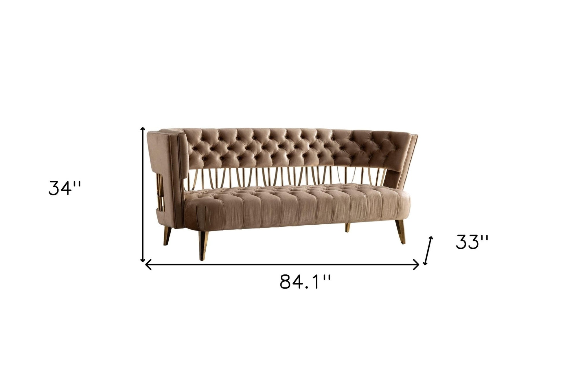 Designed for comfort and good looks, this 84-inch beige velvet sofa with gold legs is a great option to anchor your space. This solid color standard is made from sturdy and resilient velvet that has a warm and rich look and is a super soft and comfortable to the touch. Solid colors give you lots of decorative options and are easy to work into your decor scheme. Tuxedo arms offer a comfy place to rest. Gold metal legs effortlessly elevate the room and add a touch of contemporary design. A great showpiece for your room, this sofa is a must have. 34-inch H x 84.1-inch W x 33-inch D