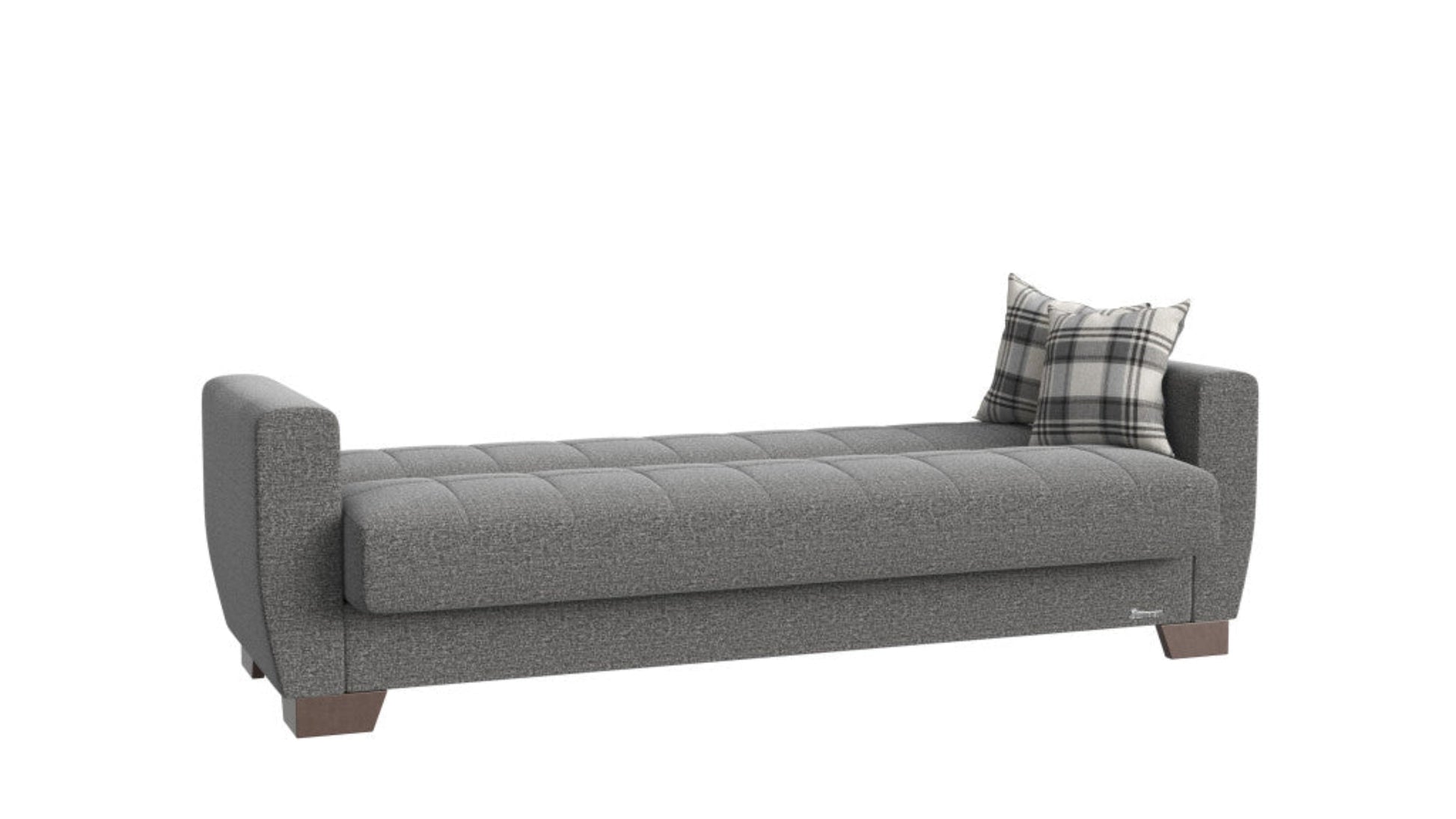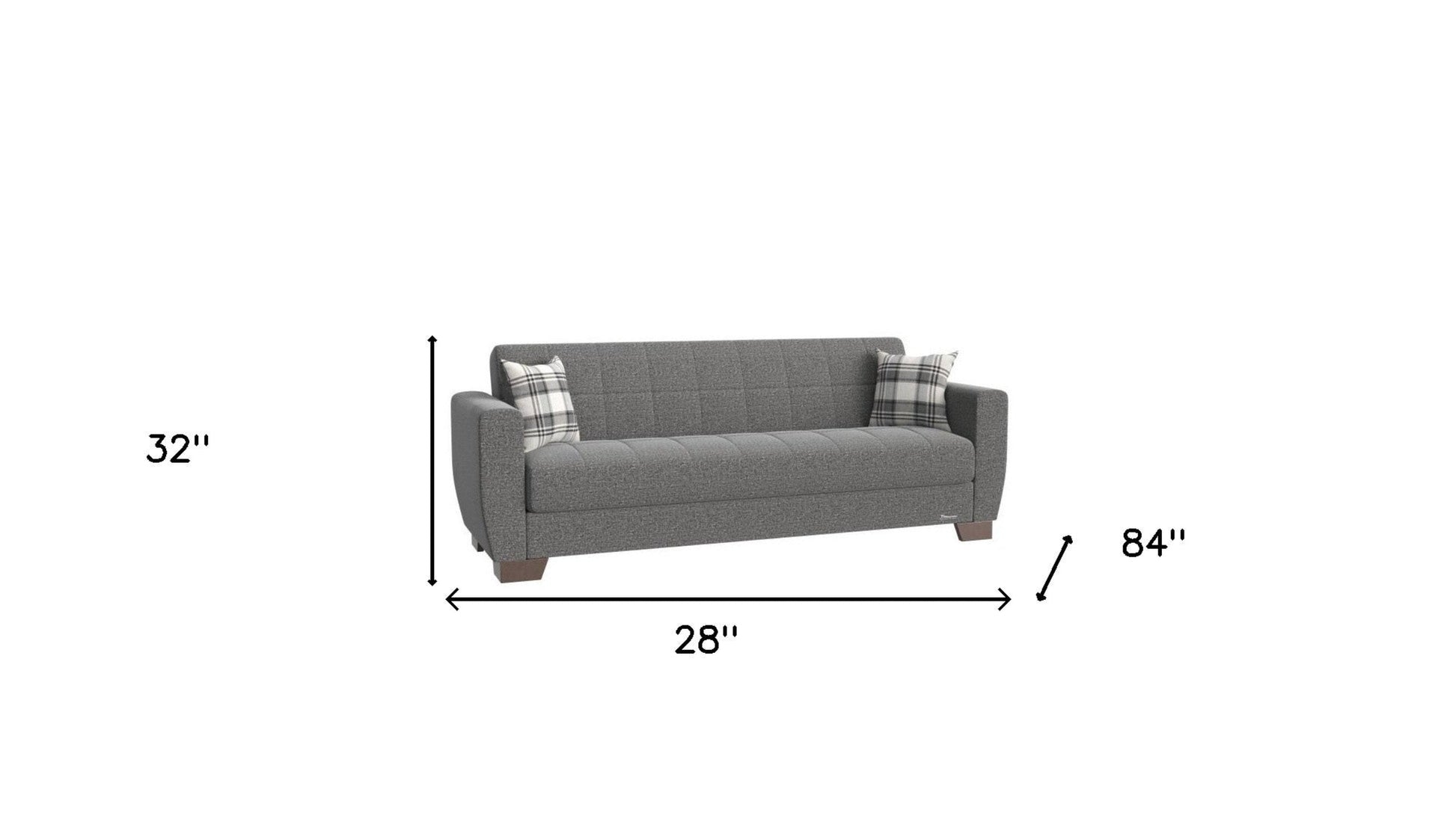 Add an air of fashion to your space with this fabulous 84-inch gray chenille sleeper sleeper sofa and toss pillows with brown legs. This solid color sleeper is made from sturdy and resilient chenille that has a warm and rich look and is a super soft and comfortable to the touch. Solid colors give you lots of decorative options and are easy to work into your decor scheme. Square arms offer a comfy place to rest. Brown solid wood legs effortlessly elevate the room and add a touch of contemporary design. Built to last, this sofa will be a great centerpiece for your room. 32-inch H x 84-inch W x 28-inch D