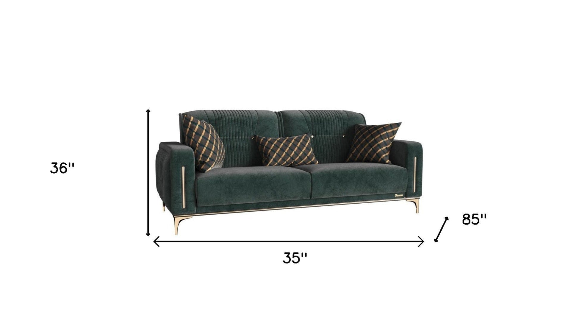 Designed for comfort and good looks, this 85-inch green microfiber sleeper sofa and toss pillows is a great option to anchor your space. Built to last, this solid color standard is upholstered with microfiber that is designed to be soft, resilient, easy to maintain, and stand the test of time. Solid colors give you lots of decorative options and are easy to work into your decor scheme. Sinuous springs construction gives this piece strong support and makes it comfortable to sit even for long periods of time. Recessed arms offer a comfy place to rest. Green solid wood legs effortlessly elevate the room and add a touch of contemporary design. A great showpiece for your room, this sofa is a must have. 36-inch H x 85-inch W x 35-inch D