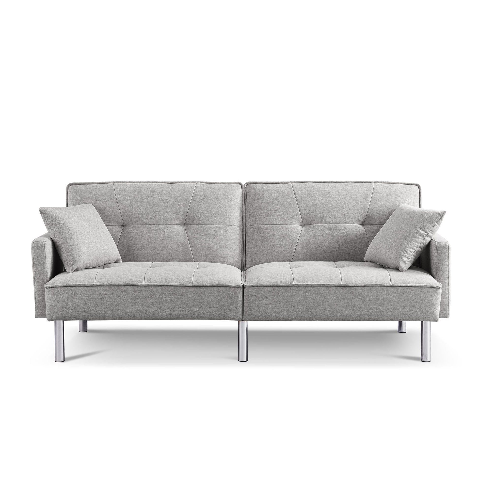 Designed for comfort and good looks, this 85-inch light gray polyester blend convertible futon sleeper sofa and toss pillows with silver legs is a great option to anchor your space. Built to last, this solid color convertible futon is upholstered with polyester blend that is designed to be soft, resilient, easy to maintain, and stand the test of time. Solid colors give you lots of decorative options and are easy to work into your decor scheme. Pocket spring construction gives this piece strong support and makes it comfortable to sit even for long periods of time. Track arms offer a comfy place to rest. The tufted stitching pattern adds visual interest and fine designer detailing. Silver chrome legs effortlessly elevate the room and add a touch of contemporary design. A great showpiece for your room, this sofa is a must have. 35-inch H x 85-inch W x 35-inch D