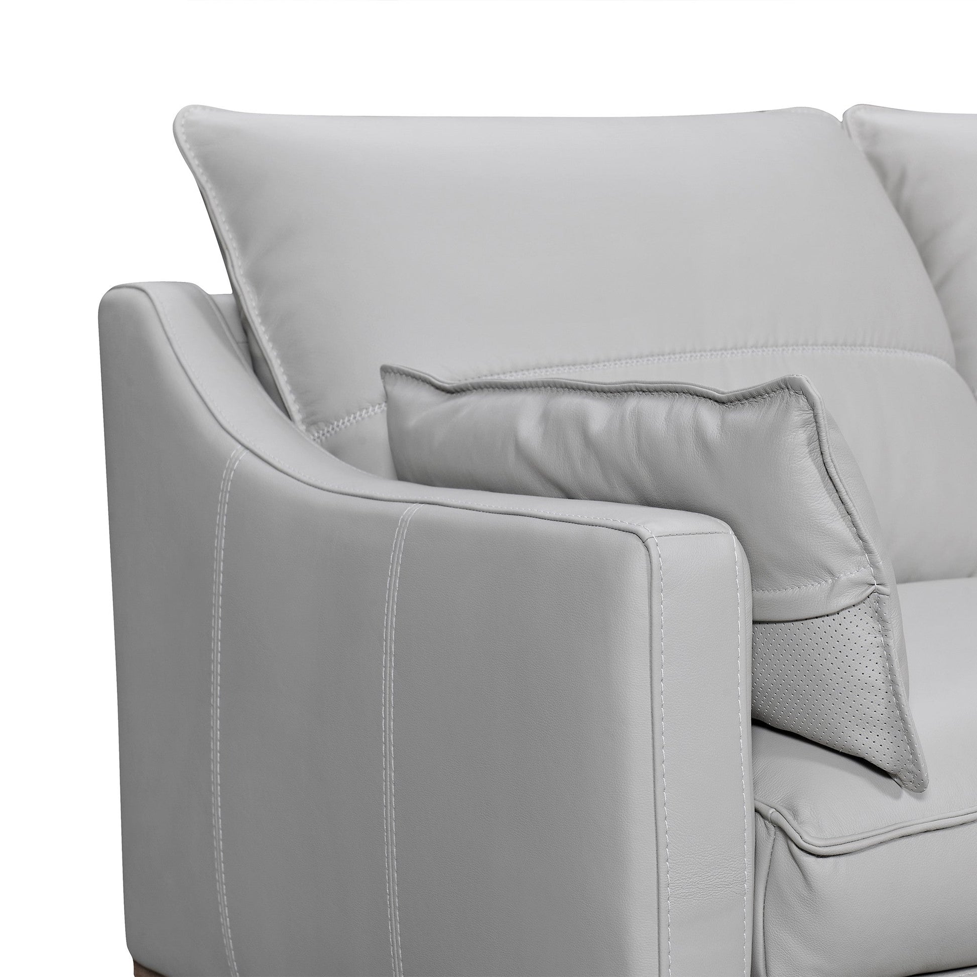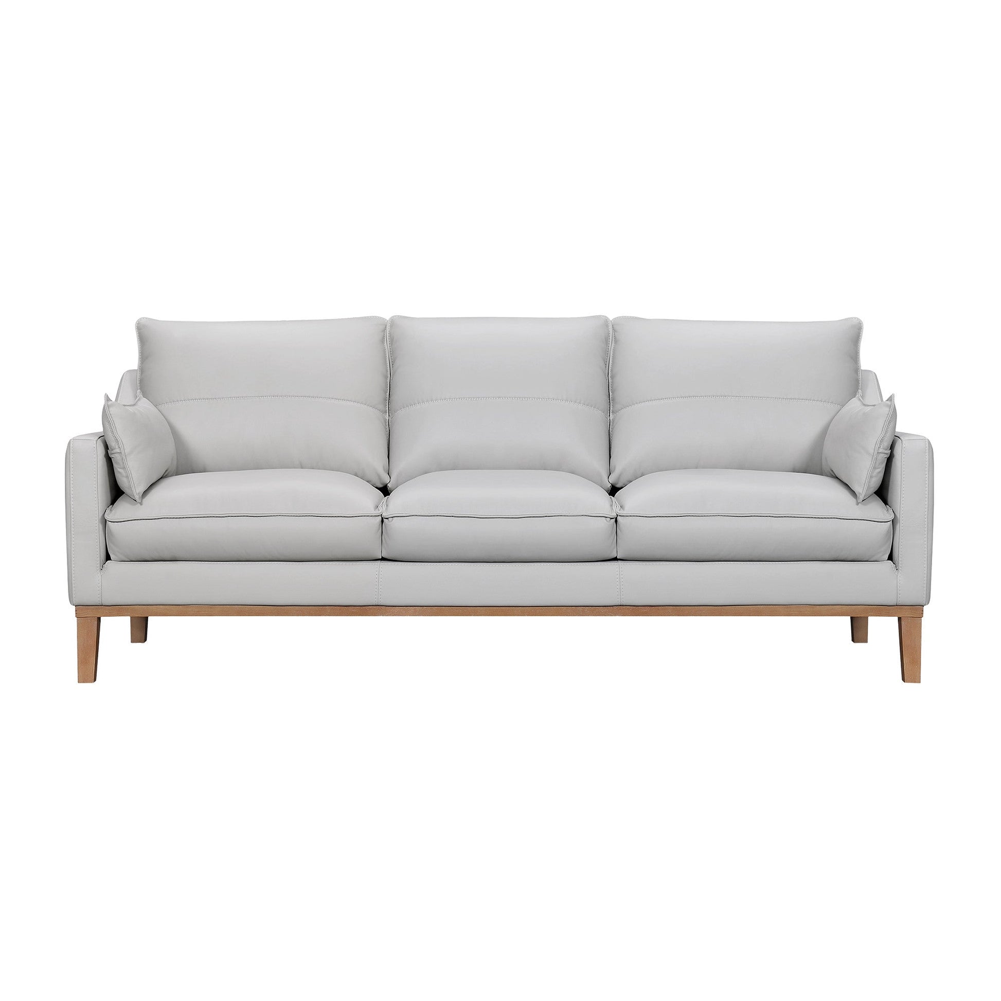 Superior construction from fabulously soft and high grade leather gives this 87-inch gray leather sofa and toss pillows with brown legs a leg up on the competition. The premium leather used makes your lounging luxuriously comfortable and adds an elegant appeal to your space. Solid colors give you lots of decorative options and are easy to work into your decor scheme. Web suspension construction gives this piece strong support and makes it comfortable to sit even for long periods of time. Removable seat cushions make this sofa easy to manage. Track arms offer a comfy place to rest. Built to last, this sofa will be a great centerpiece for your room. 37-inch H x 87-inch W x 37-inch D