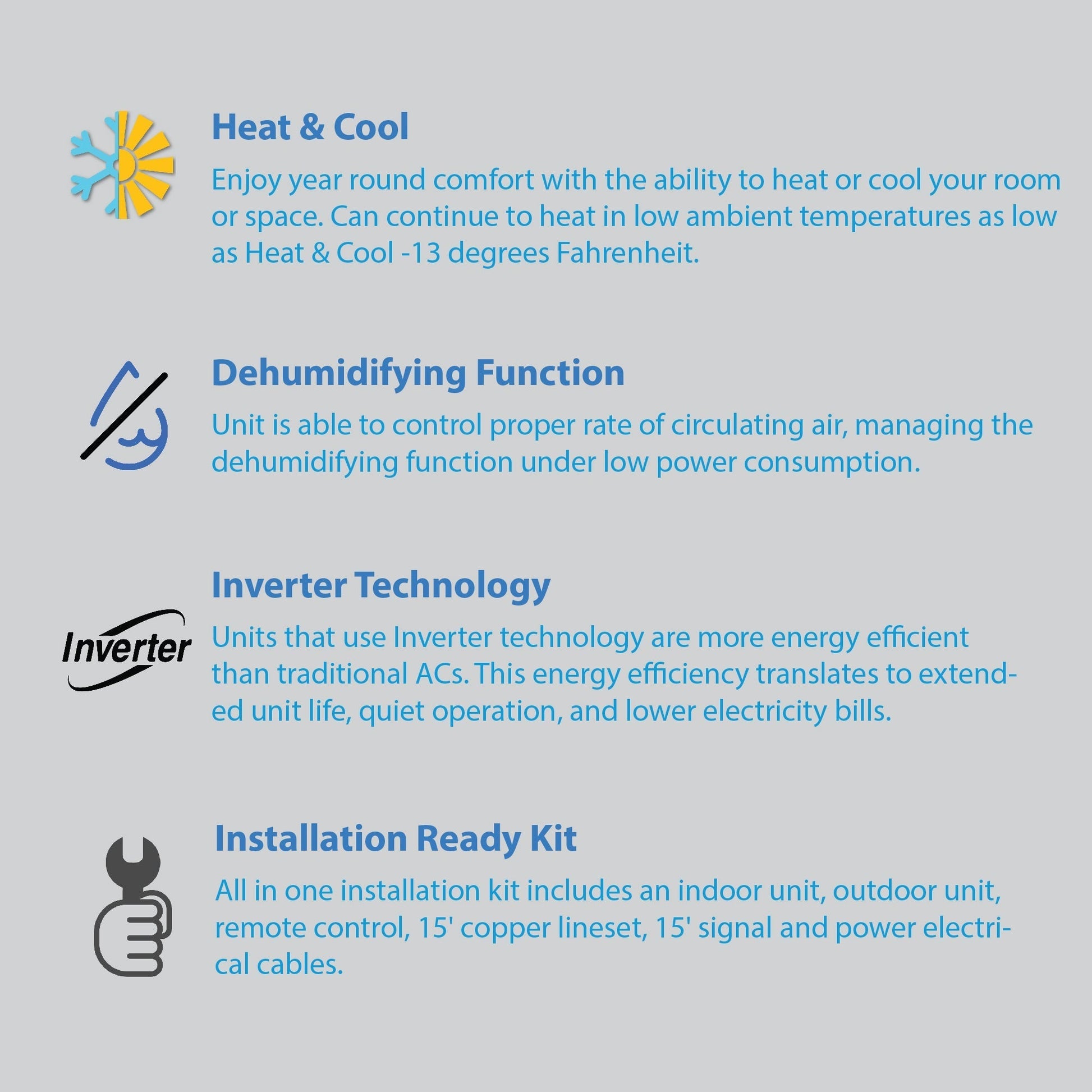 Includes indoor and outdoor units, remote control, and a 15ft copper lineset, making installation hassle-free.