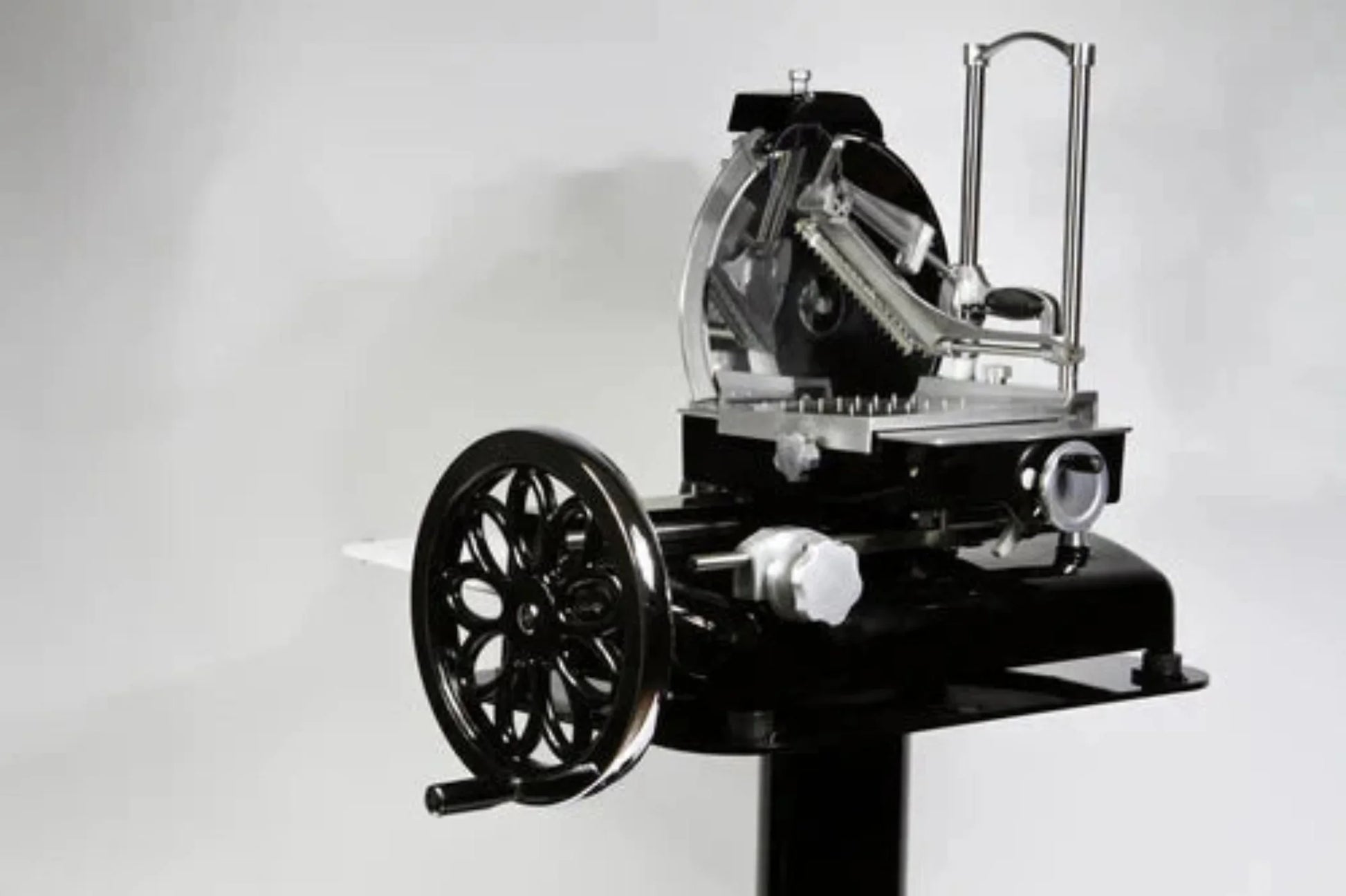 Volano Flywheel Slicer, manual, 14" blade, 0 to 3/32" cutting thickness, built-in sharpener, self-locking arm, fixed ring guard, aluminum, steel & stainless steel construction, baked enamel finish, black color, ETL-sanitation, made in Italy