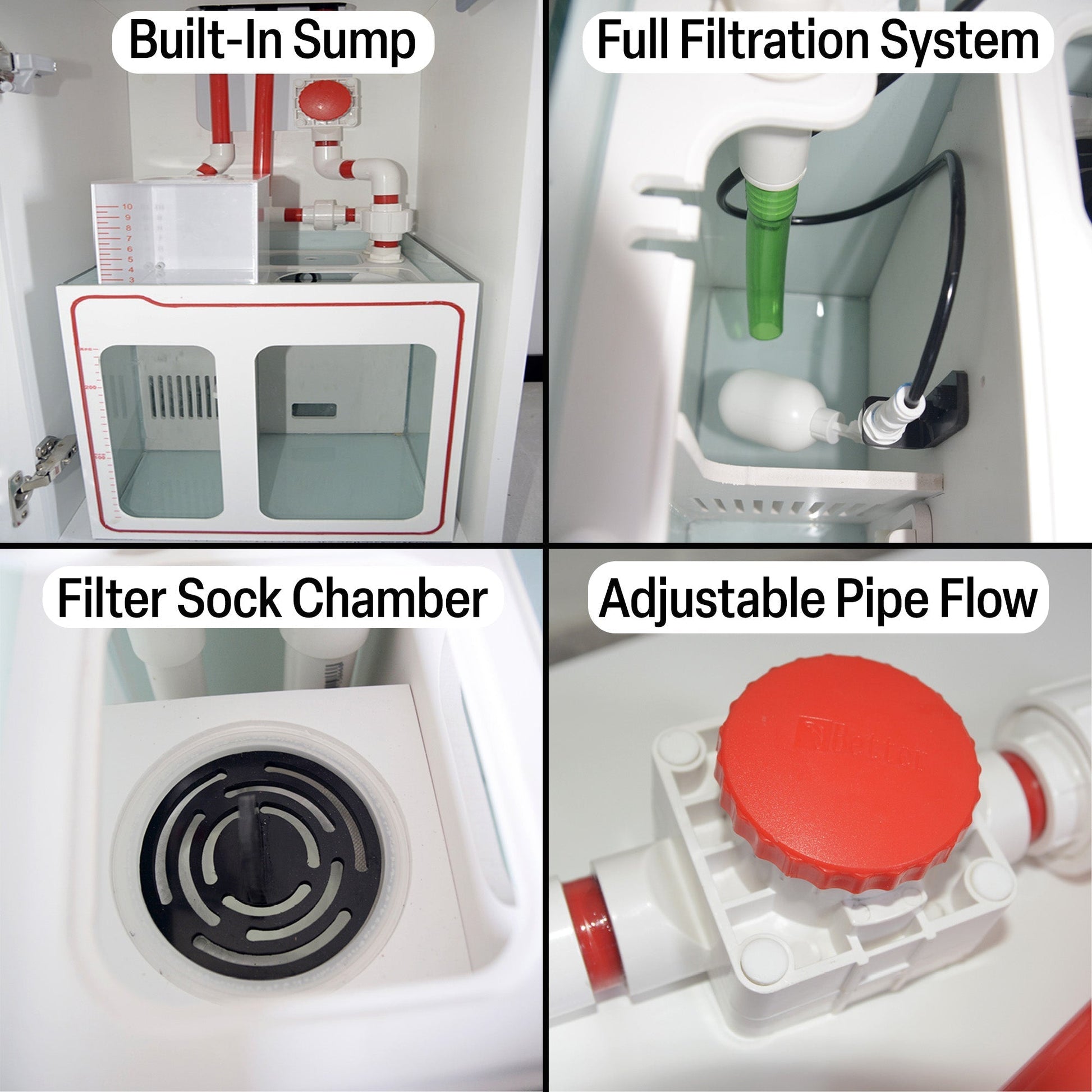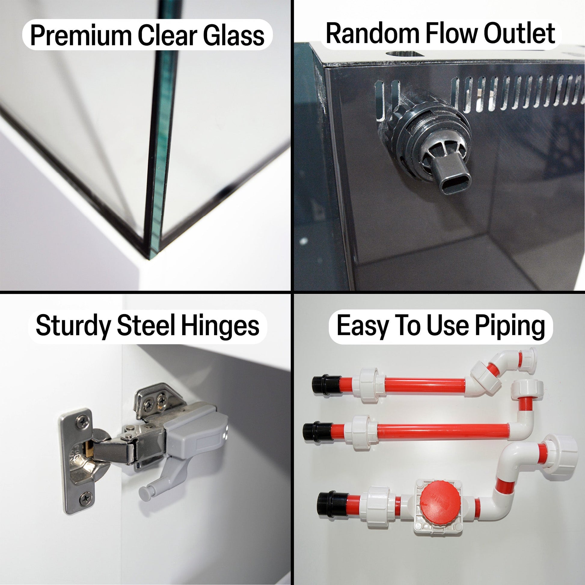 This all-in-one tank system was designed specifically to support coral reef saltwater aquarium systems. However, this system can also house freshwater fish! The rimless and frameless design of the tank offers a modern and sleek look that will look great anywhere you place it. The tank is wide enough to allow for plenty of options for aquascaping. The sump system comes with multiple compartments for various uses, helping you take care of your aquarium system in a way that is optimal for you. The random flow return pump outlet allows for better water distribution as the water flows from your sump back into your tank. The water return pipe from the sump is adjustable as well, allowing you to have complete control over your system and its needs. This all-in-one system is the perfect base for you to start your ideal aquarium setup!