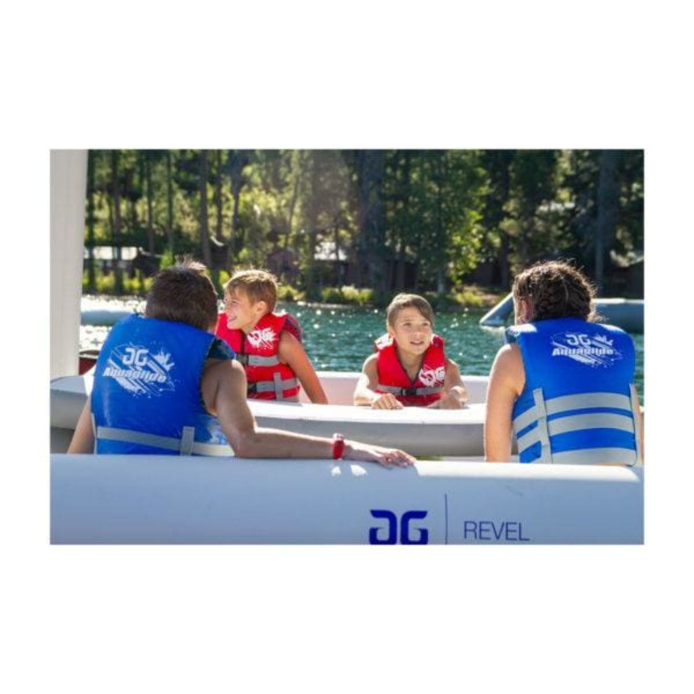 To revel means to “enjoy oneself in a lively and noisy way,” which is precisely what we intended when we designed the Revel Lounge. Featuring laid-back tatami-style seating around a family-size table, the Revel Lounge also includes inflatable backrests, and mesh-bottom footwell and cooler cutouts. The entire layout sits beneath a canopy top cover for added shade to keep everyone chill. Able to accommodate up to six users, the Revel Lounge can be used as a standalone accessory or as a social space in your personalized Aquaglide waterpark.