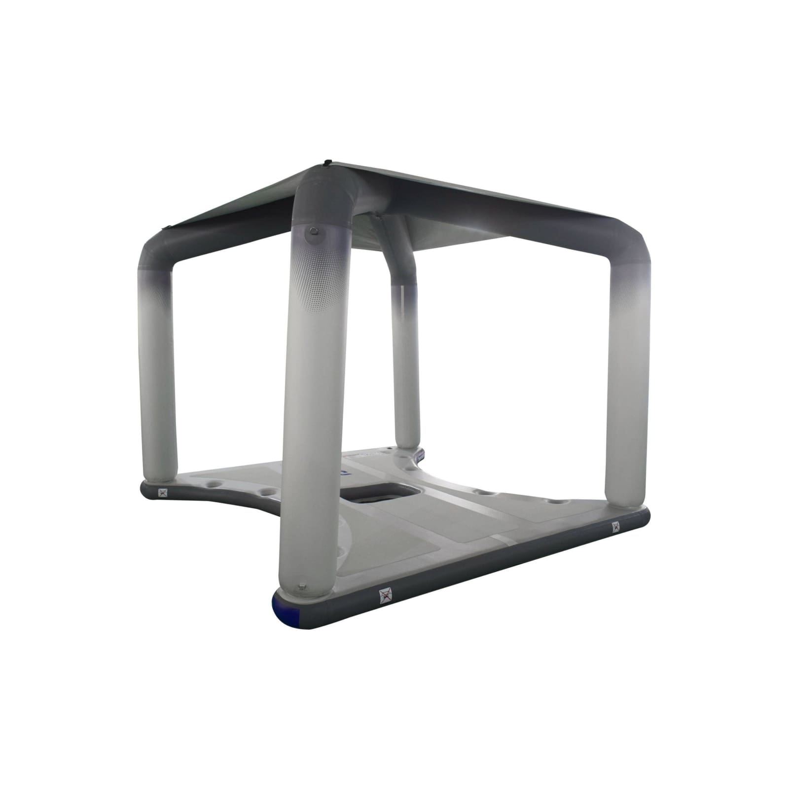 The Riviera Lounge is an inflatable water lounge designed for relaxation and socializing on the water. It features a shaded canopy, integrated cup holders, and a central cooler drop, making it ideal for groups seeking comfort and convenience.