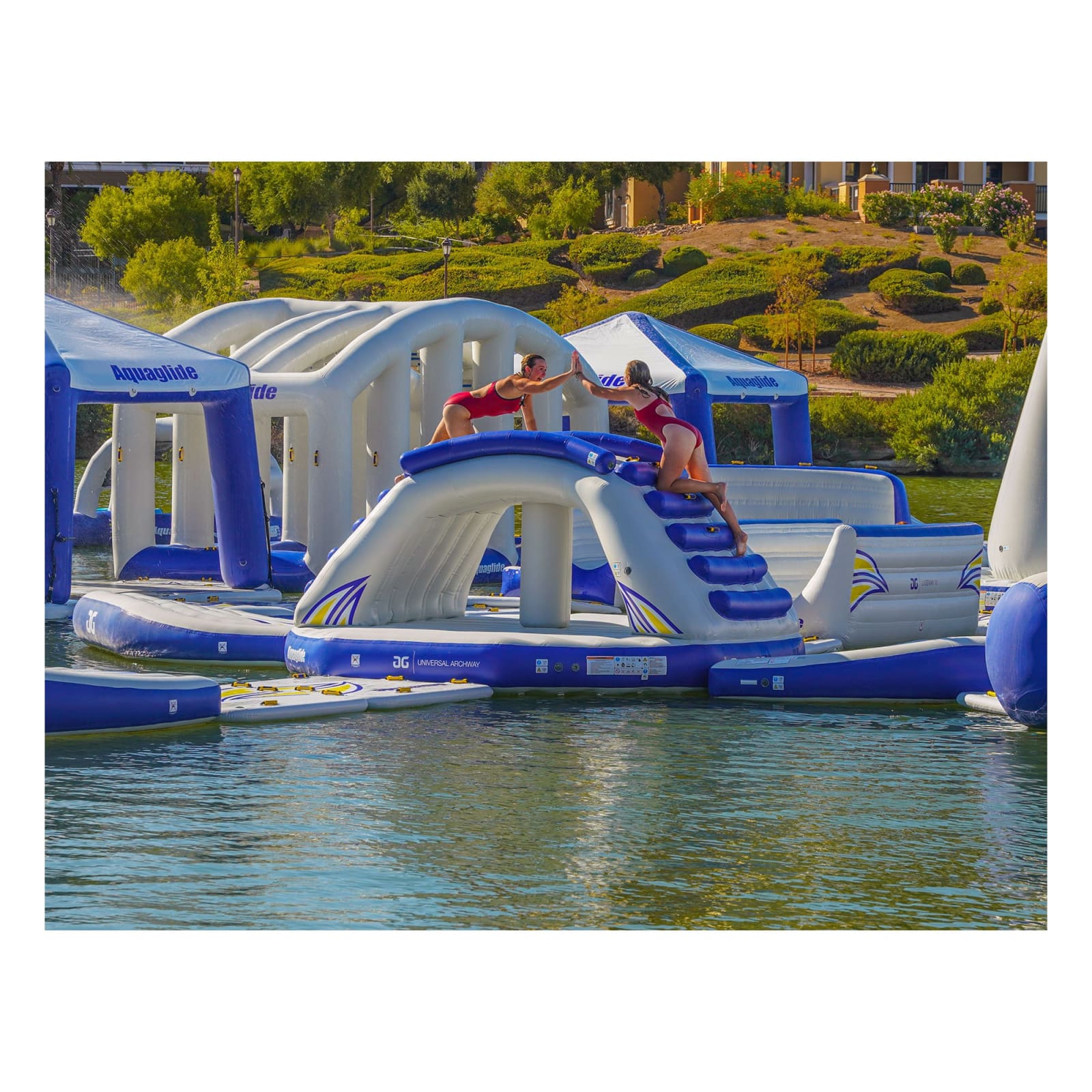 The Aquaglide Universal Archway is an inflatable climbing arch and tunnel designed to enhance any Aquaglide water park with versatile, multi-level play features.