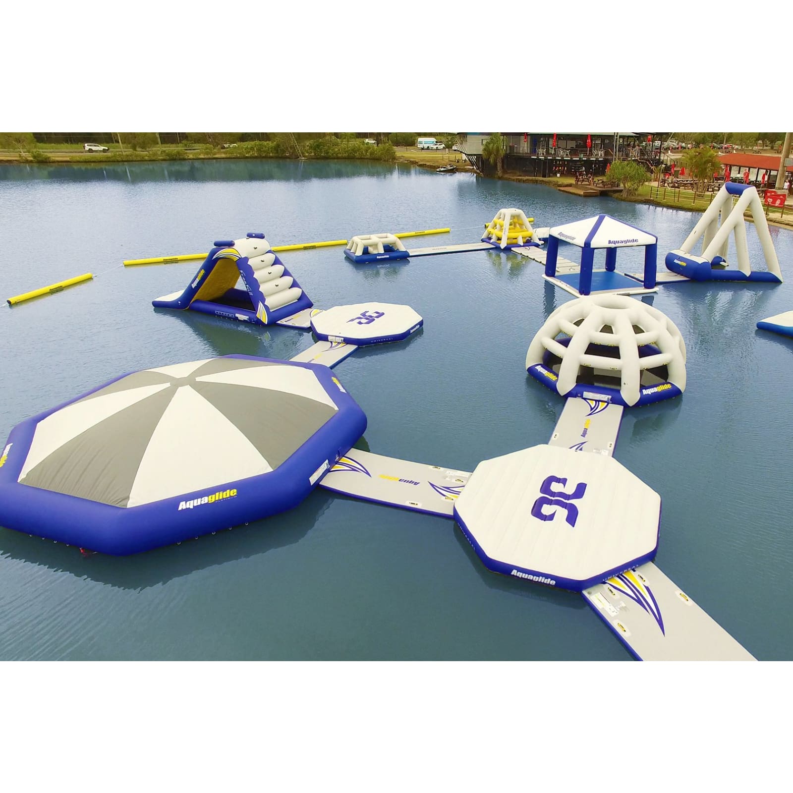 This octagon shaped platform allows Runway and Swimstep connections to connect to all 8 sides at once offering multiple angles and unlimited possibilities for Aquapark design. The Aquaglide Universal can be used as a hub, corner or anything in between.