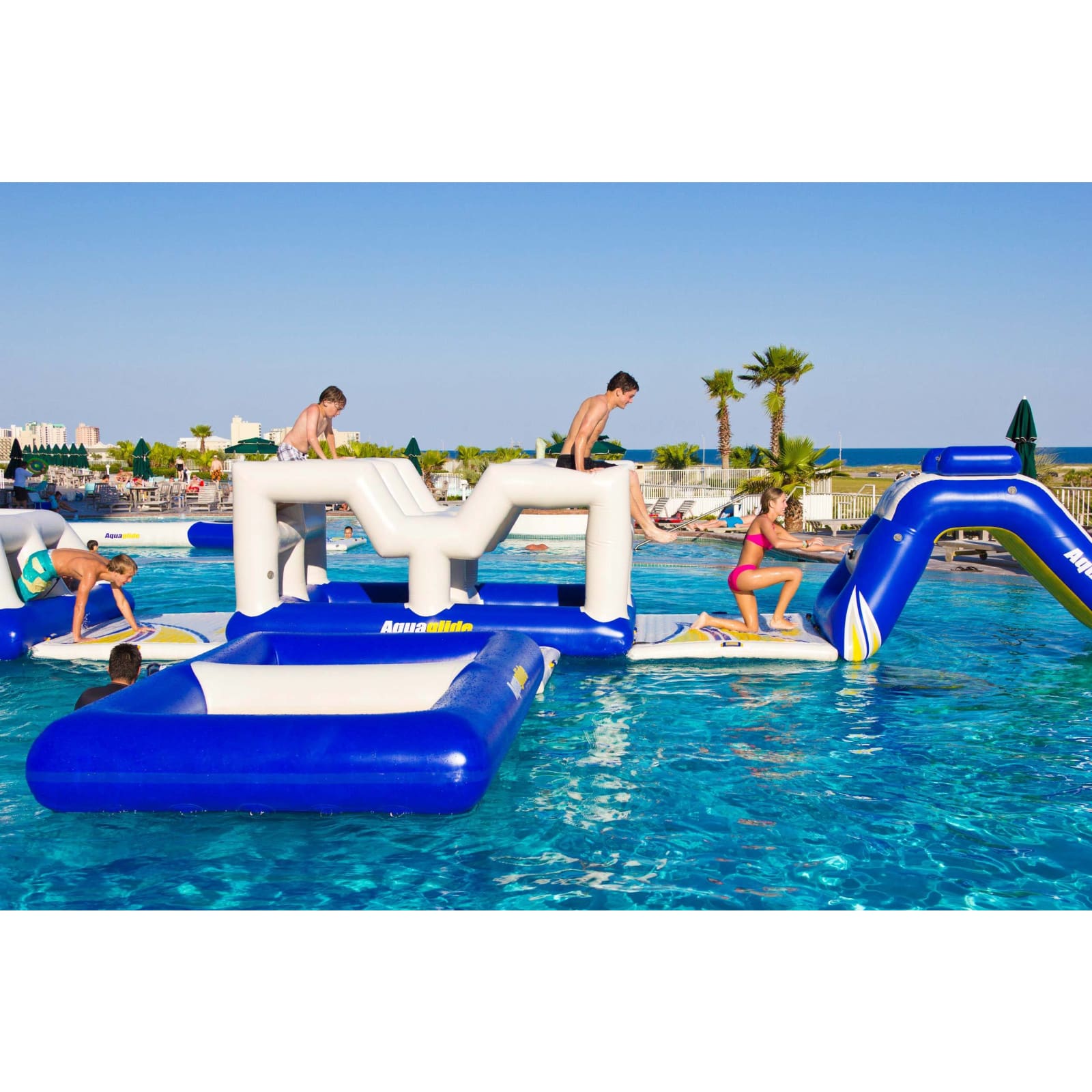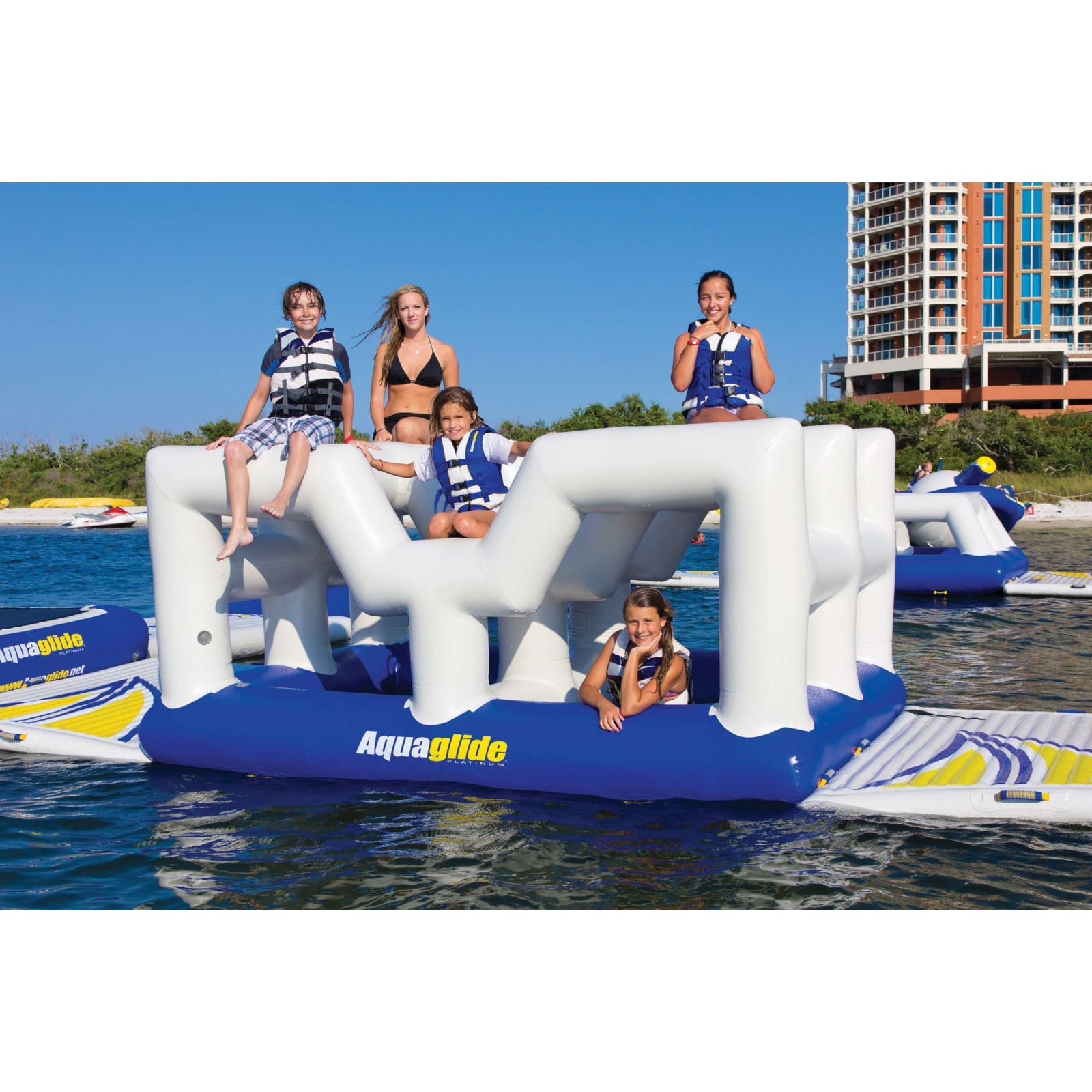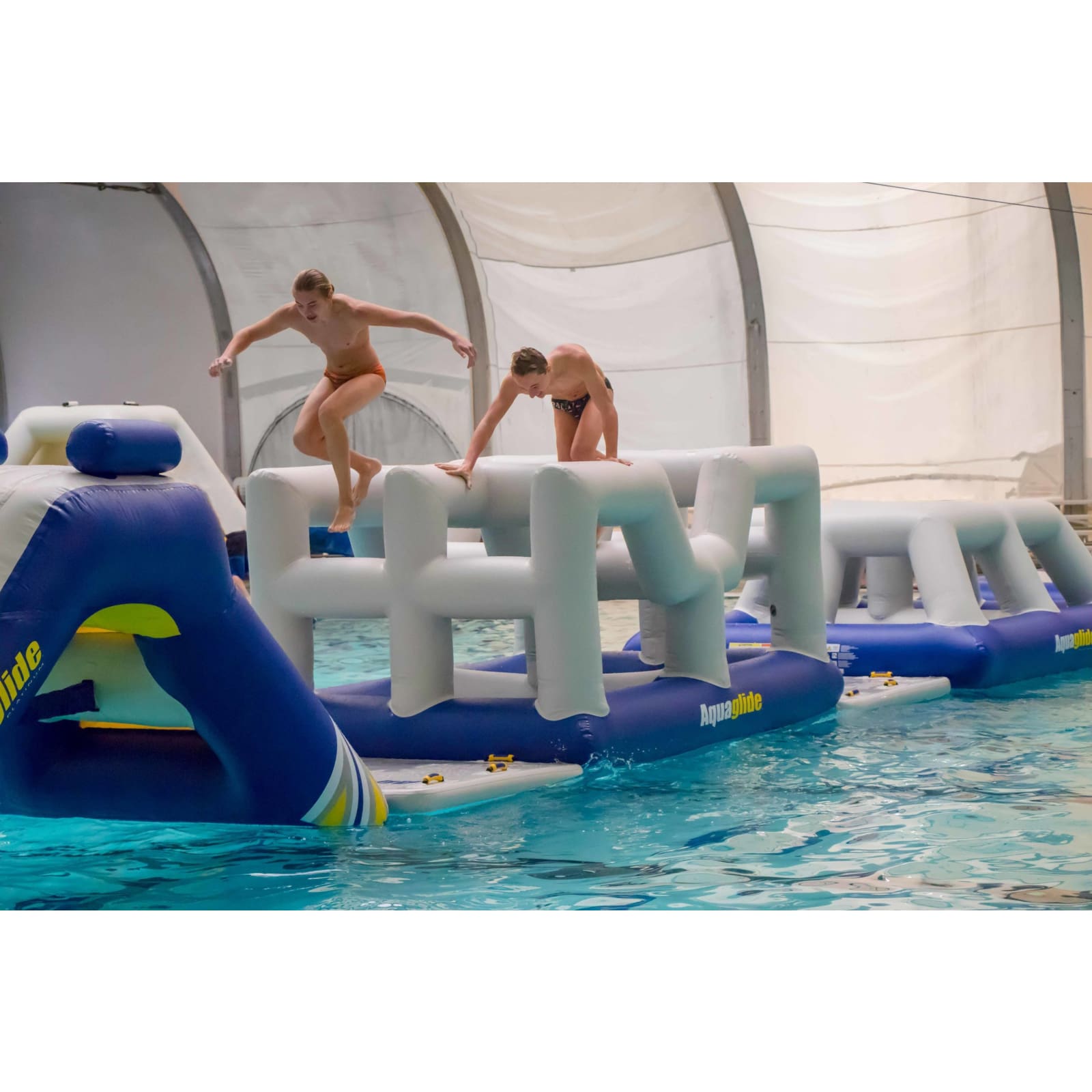 Explore inner passes or take the high road with the Aquaglide Vista. There are countless ways to travers this challenge! Interior mesh floors create fun splash zones for those who linger.