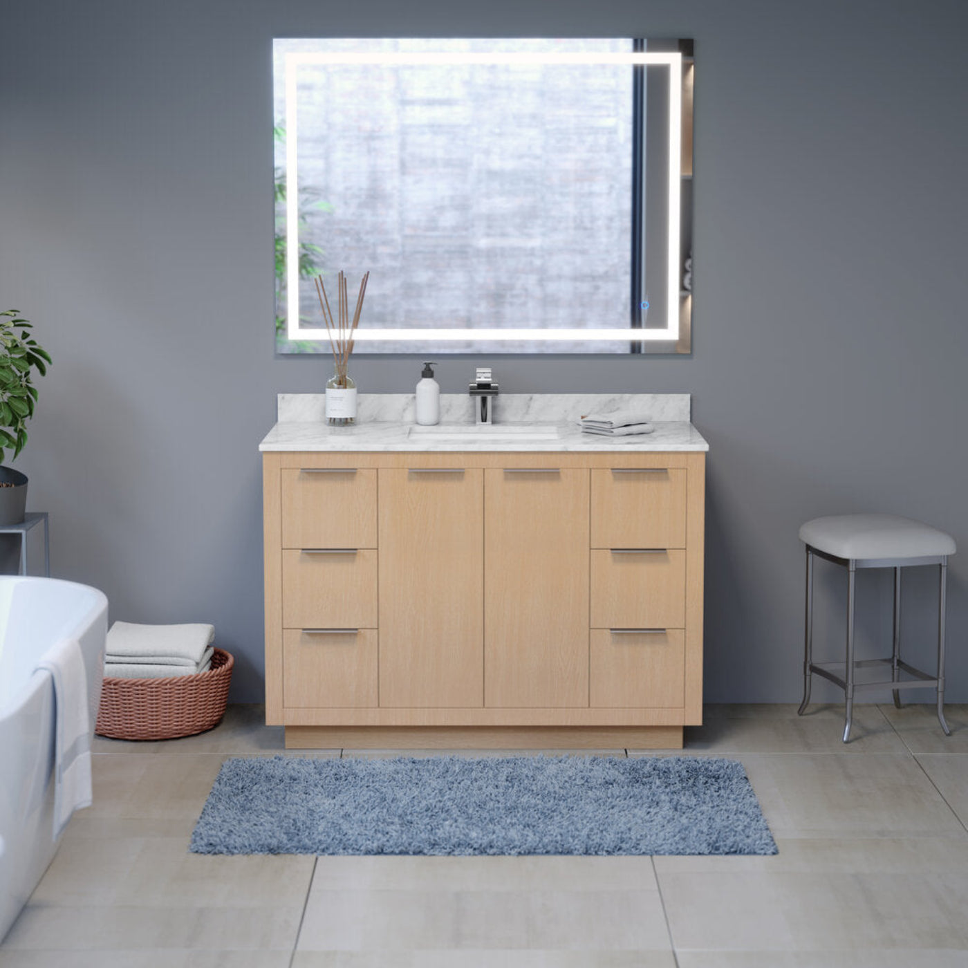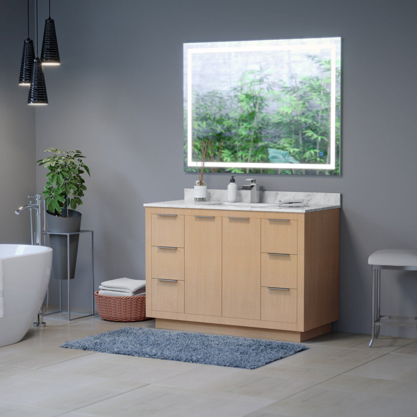 Sleek, Frameless Design: The Arpella Luci 48" x 36" LED Mirror boasts a minimalist, frameless rectangular design, enhancing the modern aesthetic of any bathroom.