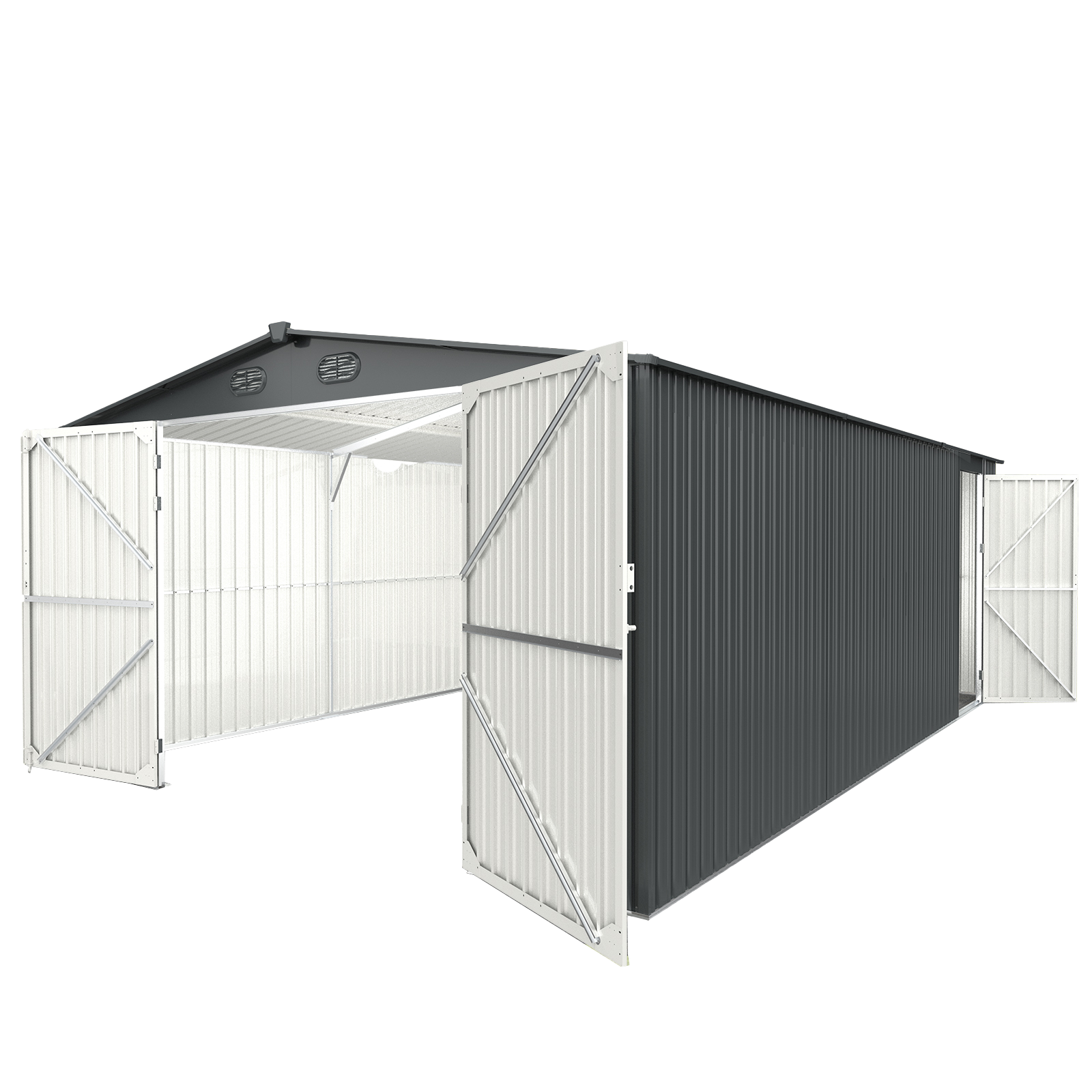 The **[AS-IS] 13'x20' Metal Storage Shed with Double Front Doors** is a durable storage solution, though it has minor scratches and damaged packaging due to being a returned item. Sold as-is, this shed is perfect for those who can address the cosmetic issues. Available for pick-up only, with no returns accepted, it's ideal for restoration or customization projects.