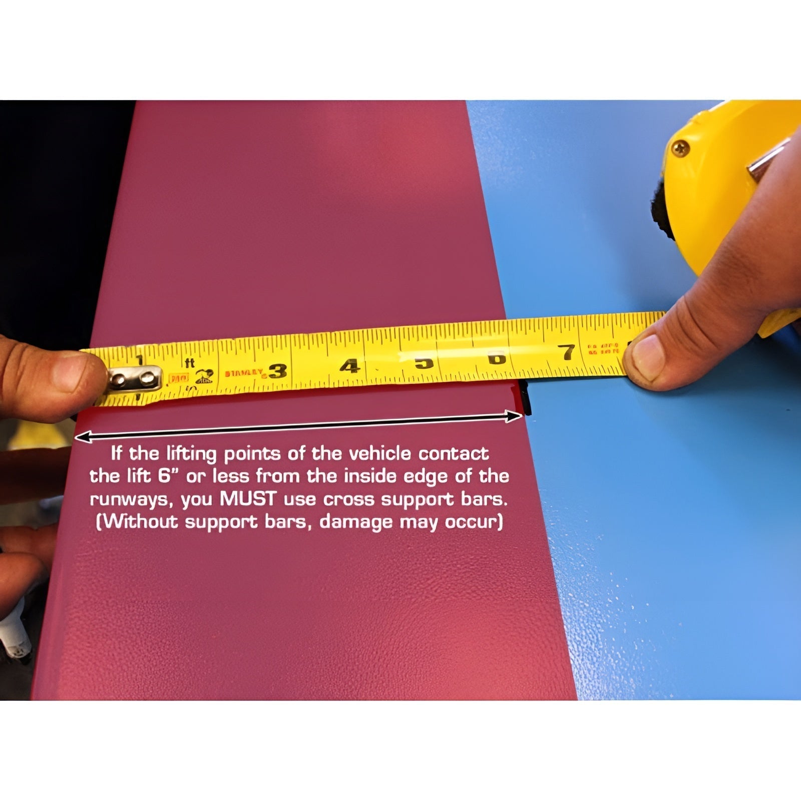 The Atlas 7K Kwik Bay is a free standing 7,000 lb. capacity portable scissor lift. The Atlas 7K Kwik Bay is the perfect lift for Commercial Quick Service Bays and wheel service specialists that need extra lifting height. This portable lift easily raises a 7,000 lb. car or truck to a comfortable working height and does not require the customer to position arms under the lifting points of the car. The vehicle is driven over the scissor ramps and the operator simply positions the heavy duty rubber block assemblies under the correct lifting points. The operation is very quick and the chance for any damage to the underside of the car is minimal. The large foot print of the Kwik Bay creates a steady platform for any raised vehicle. The lift has a lifting height of over 39 and remains rock solid at all safety lock positions.The unique open middle of the Atlas 7K Kwik Bay allows access to many areas on the underside of the car that are not easily accessible with other portable mid-rise lifts employing a full superstructure. The approach ramps lock into a horizontal position to extend the runway platform length by an additional 10 on each end (effective lifting surface is expanded from 57 to 78). The dual power cylinders and the solid safety lock bars make the Kwik Bay one of the most versatile and easy to use scissor mid-rise lifts sold in the USA and Canada.As with any scissor lift that is completely open (no cross support bar in the front or rear to keep the platforms level), the operator must make sure that the vehicles frame is positioned at least 6 inches from the inside of the platform. If too much weight is positioned near the edges of the platform (closer than 6 inches from the inside edges), the platforms may become pigeon toed and damage may occur. We sell the Atlas scissor lift support bar kit for those professional customers who are lifting heavy vehicles with narrow frames. As with any lift designed with horizontal cylinders it is best to allow some space (2-6 inches) between the lifting surface of the lift and vehicles lifting points.