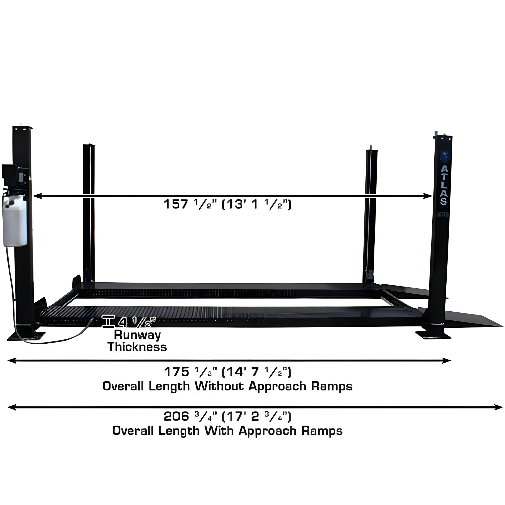 A: The dimensions of the Atlas Garage PRO8000 are designed to fit in most garage spaces, with an extended lifting height that allows for easy vehicle storage and maintenance.