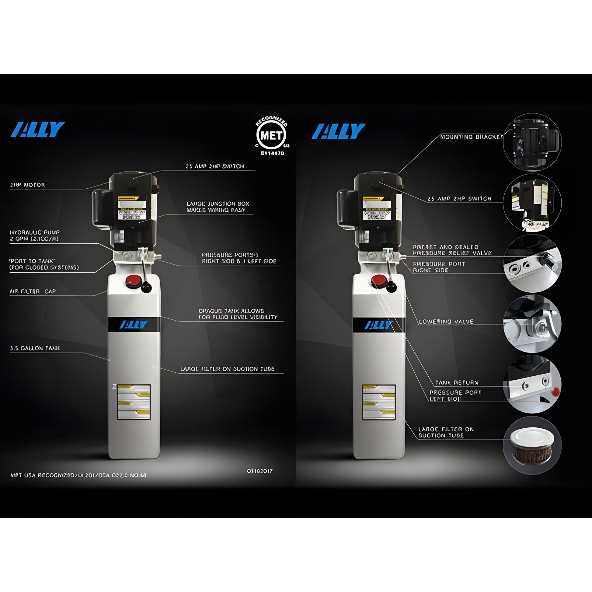 The Atlas Platinum PVL14 is a four post commercial grade Heavy-Duty lift designed with the professional shop in mind. This lift can accommodate a variety of cars, vans, SUVs, trucks, and even some light & medium duty commercial vehicles.The Platinum PVL14 uses a high strength cable system (with a under runway oversized hydraulic cylinder) powered by a 220 volt (single phase) power unit to raise and lower the lift. Many competitors use an “old style” chain lifting system with an exposed hydraulic cylinder system. Old style chain lifts are difficult to “level” properly and the exposed hydraulic cylinder is responsible for numerous “door dings”.The Atlas Platinum PVL14 is also ALI and backed by one of the industry’s best warranties for an added peace of mind.This product features an ALLY Hydraulic AL2650 power unit. This premium power unit is by MET Laboratories Inc. for electrical compliance in the United States and Canada. Extra heavy-duty armatures and more motor windings with increased silver metal included in the wires and connections create far less heat generation and allow ALLY Hydraulic power units to maintain constant torque through the lifting process. This power unit also carries an industry leading two-year limited warranty.This combo package also includes two of the popular ALI Atlas® Platinum RJ7000 Rolling bridge jacks. The jacks are perfect for raising a vehicles wheels off the lifts runways in order to service tires and brakes.