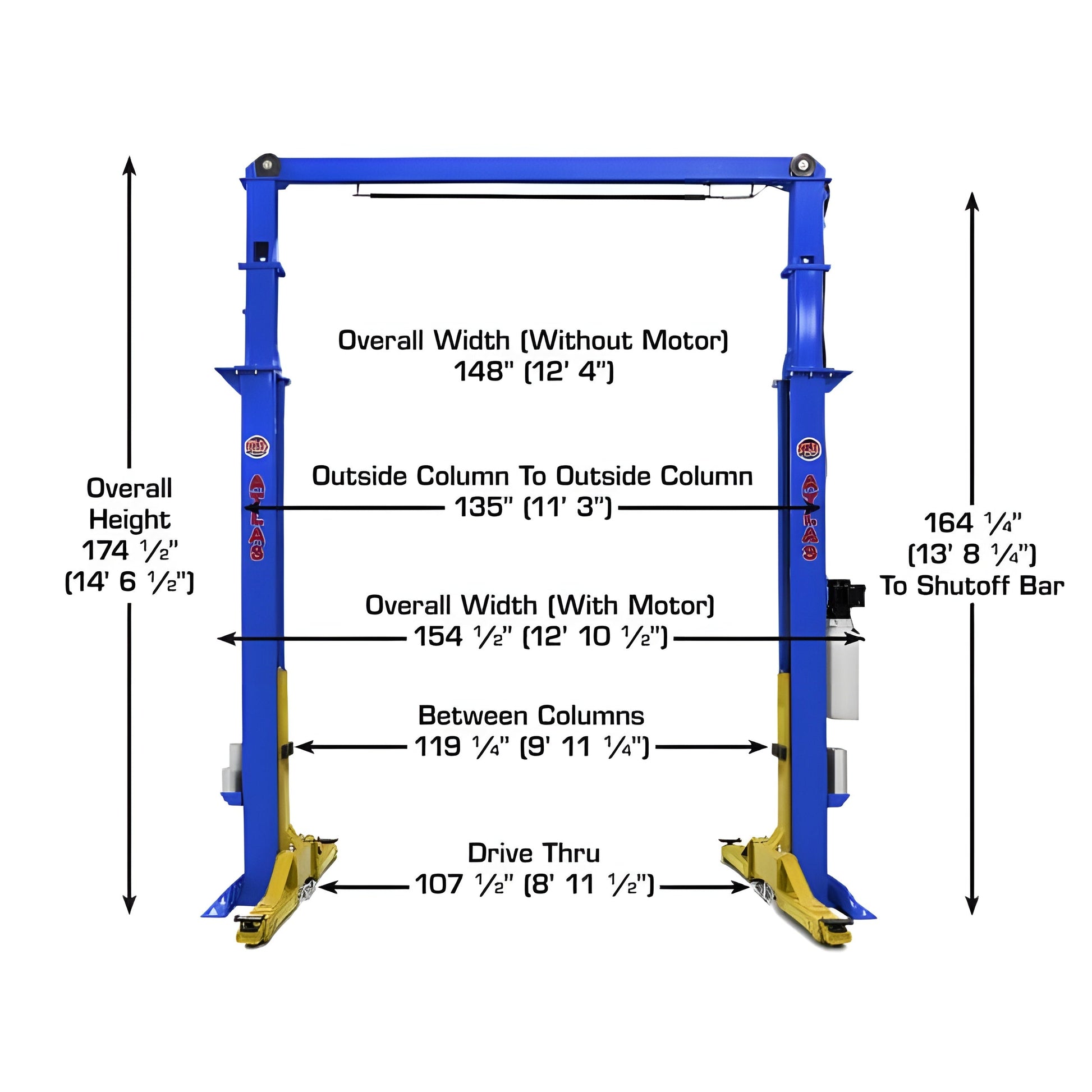 The Atlas Platinum PVL15 is an ALI CERTIFIED, commercial grade, 15,000 lb. capacity overhead two-post lift designed to accommodate both long wheel base trucks and service trucks. The Platinum PVL15 has an overall height of 174 1/2″ (14′ 6 1/2″), but can be extended by an extra 2 feet to accommodate taller vehicles with the Height Extension Kit.This product features an ALLY Hydraulic AL2300 Power Unit. This premium power unit is certified by MET Laboratories Inc. for electrical compliance in the United States and Canada. Extra heavy-duty armatures and more motor windings with increased silver metal included in the wires and connections create far less heat generation and allow ALLY Hydraulic power units to maintain constant torque through the lifting process. This power unit also carries an industry leading two-year limited warranty.