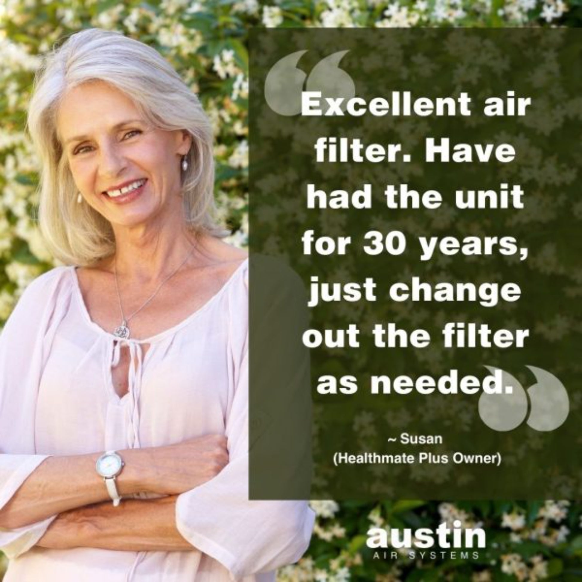 The Austin Air HealthMate Plus® Filter has a true medical grade HEPA (High Efficiency Particulate Arresting) filter surrounded by a blend of potassium iodide impregnated carbon/zeolite mixture. This additive, along with the activated carbon and zeolite, delivers greater capacity for the filtration of chemicals and gases including Volatile Organic Compounds (VOCs). The HEPA filters 99.97% of all particles down to 0.3 microns in size. Consequently, this combination of medias provide improved relief in highly contaminated air spaces for those who are severely chemically sensitive.