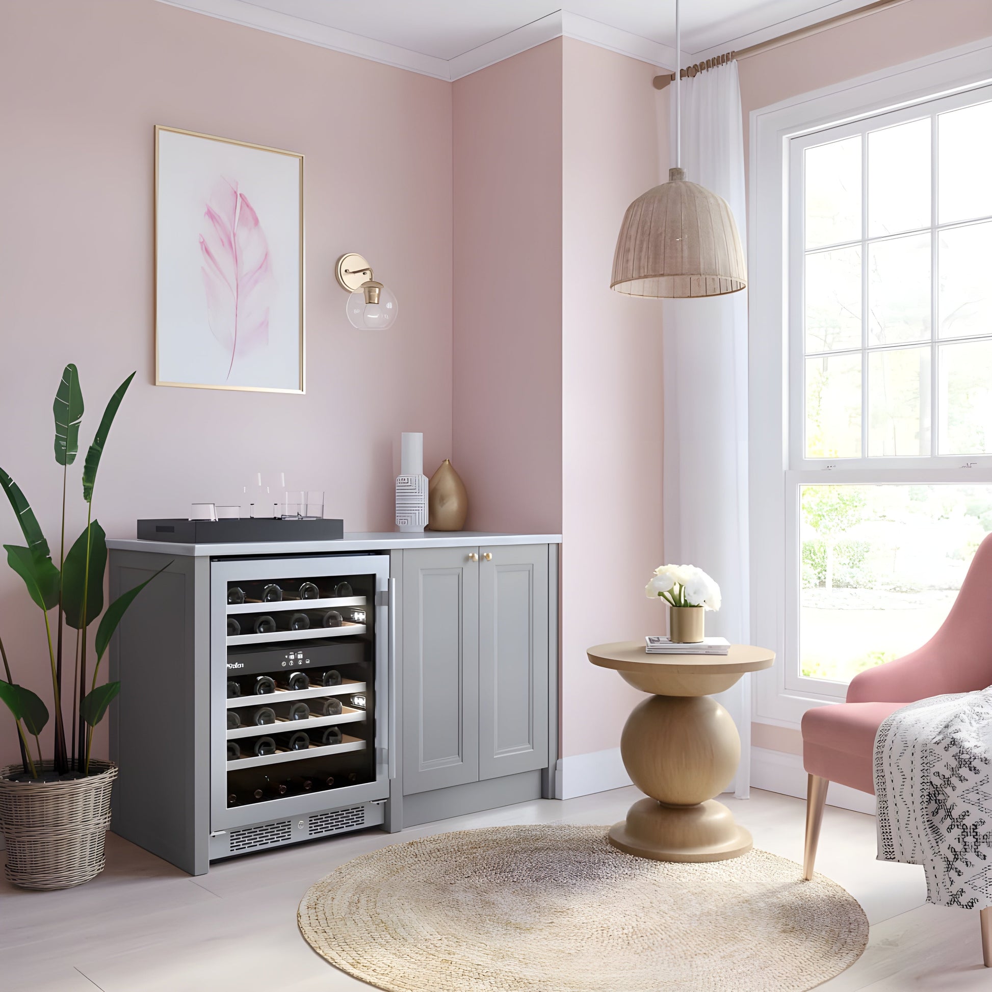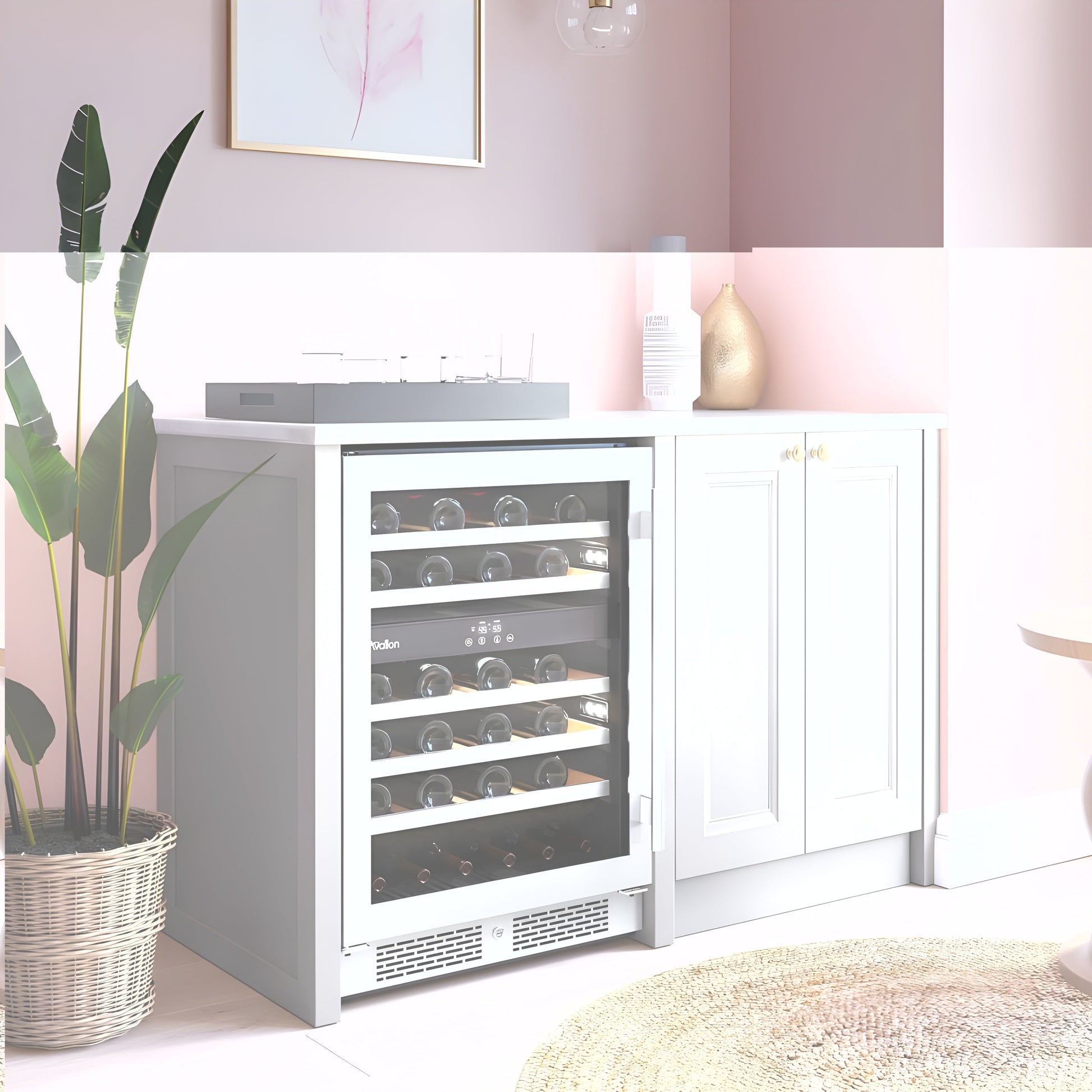 A: A high-capacity, dual-zone wine cooler with a 45-bottle capacity and a left-swing door. Ideal for wine enthusiasts seeking precise temperature control for storing both red and white wines.