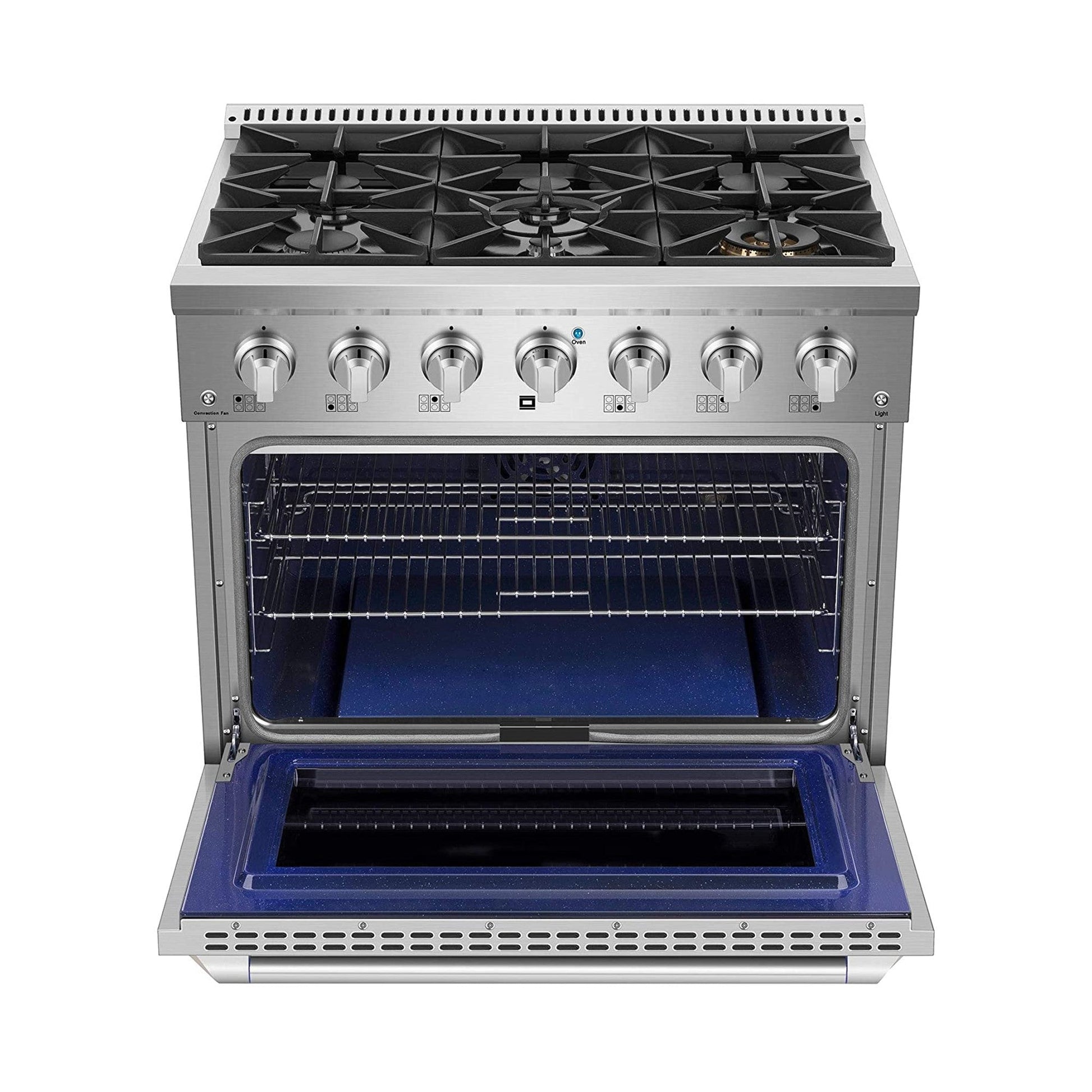 [High BTU 6 Burners] - High-performance gas burners which allow you to cook from a high heat for boiling, frying, or searing to a low simmer for delicate sauces. Includes two 15,000 BTU rapid burners, one 12,000 BTU and two 9,000 BTU semi-rapid burners with one 6,000 BTU axillary burner.