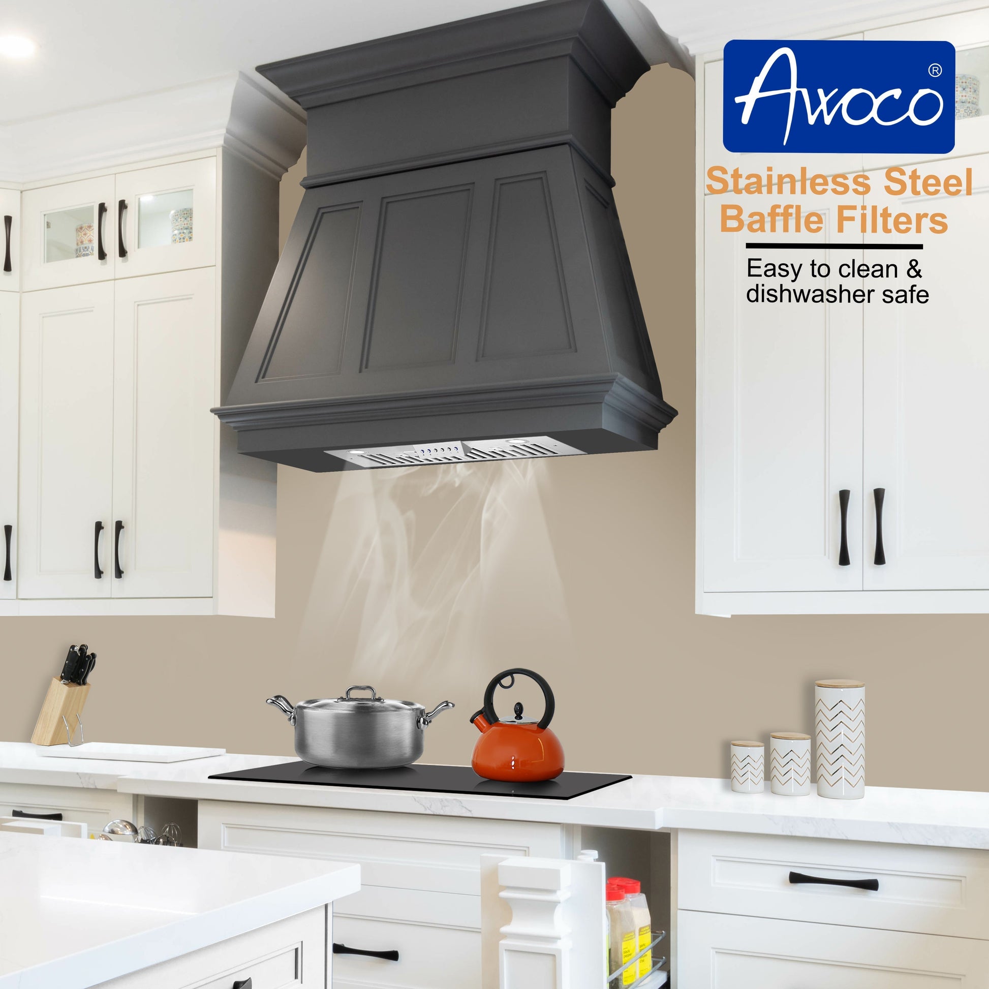 A: The Awoco RH-IT06-M has an airflow capacity of 800 CFM, effectively removing smoke, grease, and odors from your kitchen.