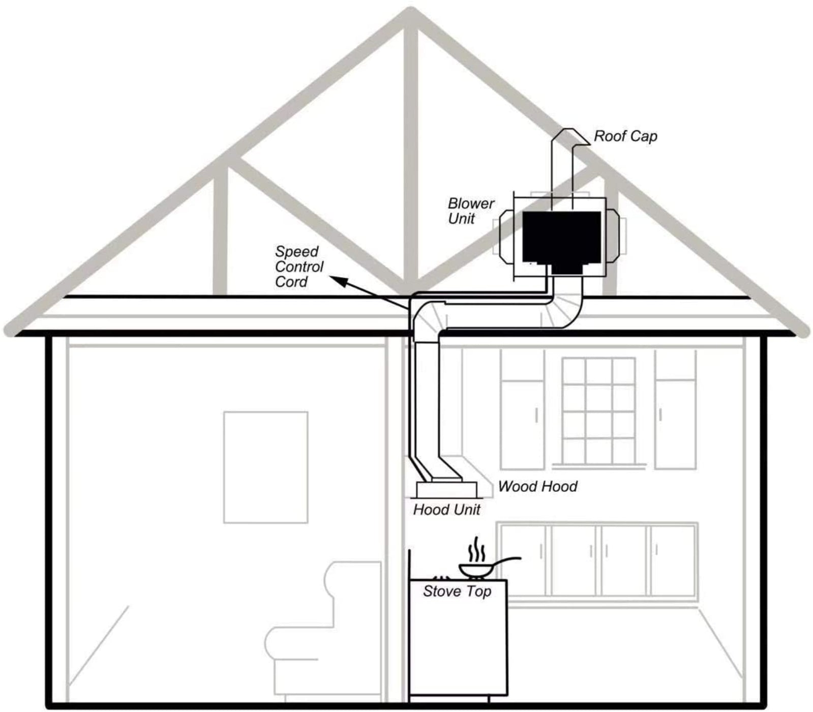 The restaurant exhaust fans are on the roof; therefore, moving the blower to the attic is the solution for residential applications to eliminate the range hood noise. Same as the industrial inline blower, this Blower unit is in between the house exhaust vent and the range hood unit.