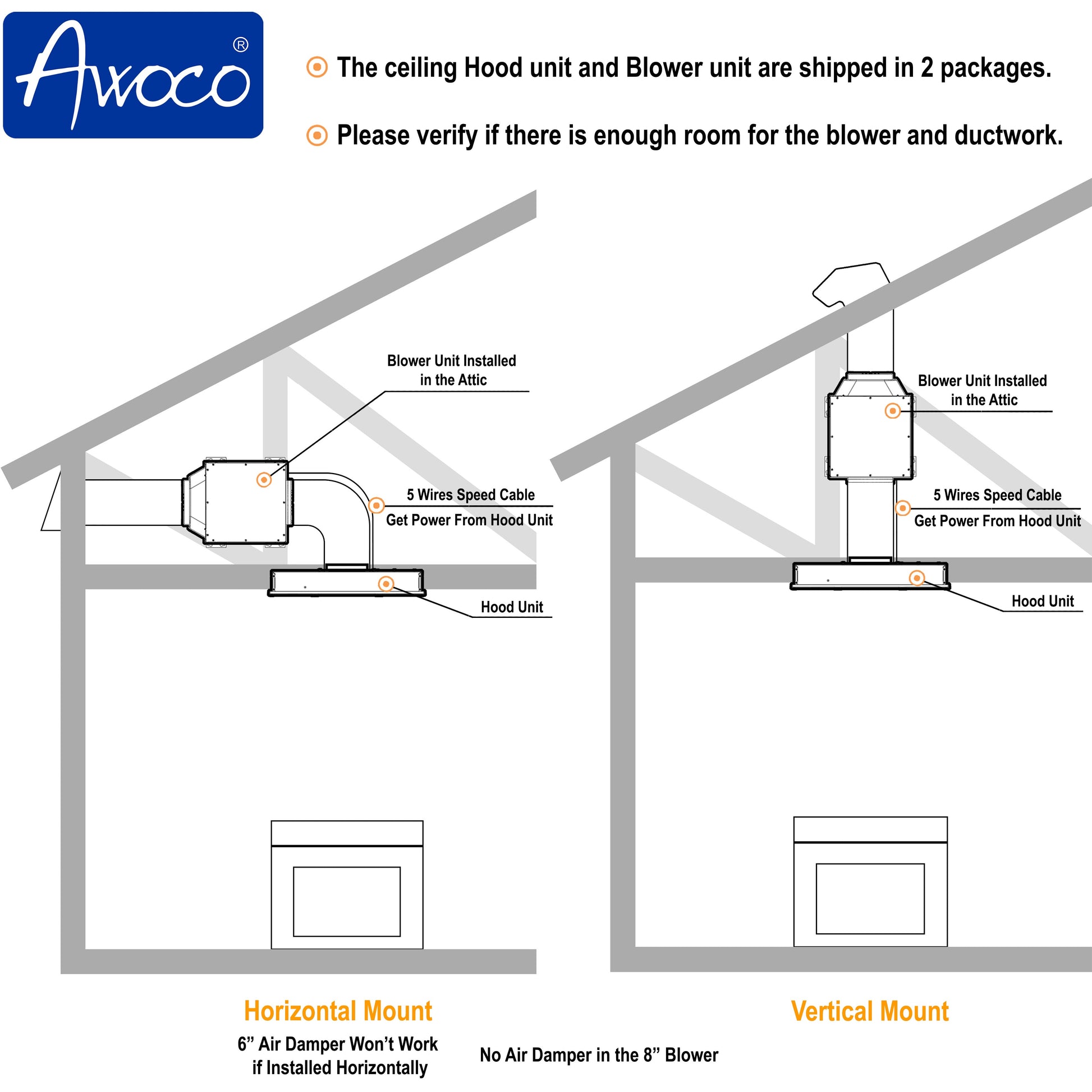 Awoco RH-IT08-R Ceiling Mount 14-1/2”D Super Quiet Split Stainless Steel Range Hood, 4-Speed, 1000 CFM, Mesh Filters, Remote Control with 8”Blower - RH-IT08-R30-COLD
