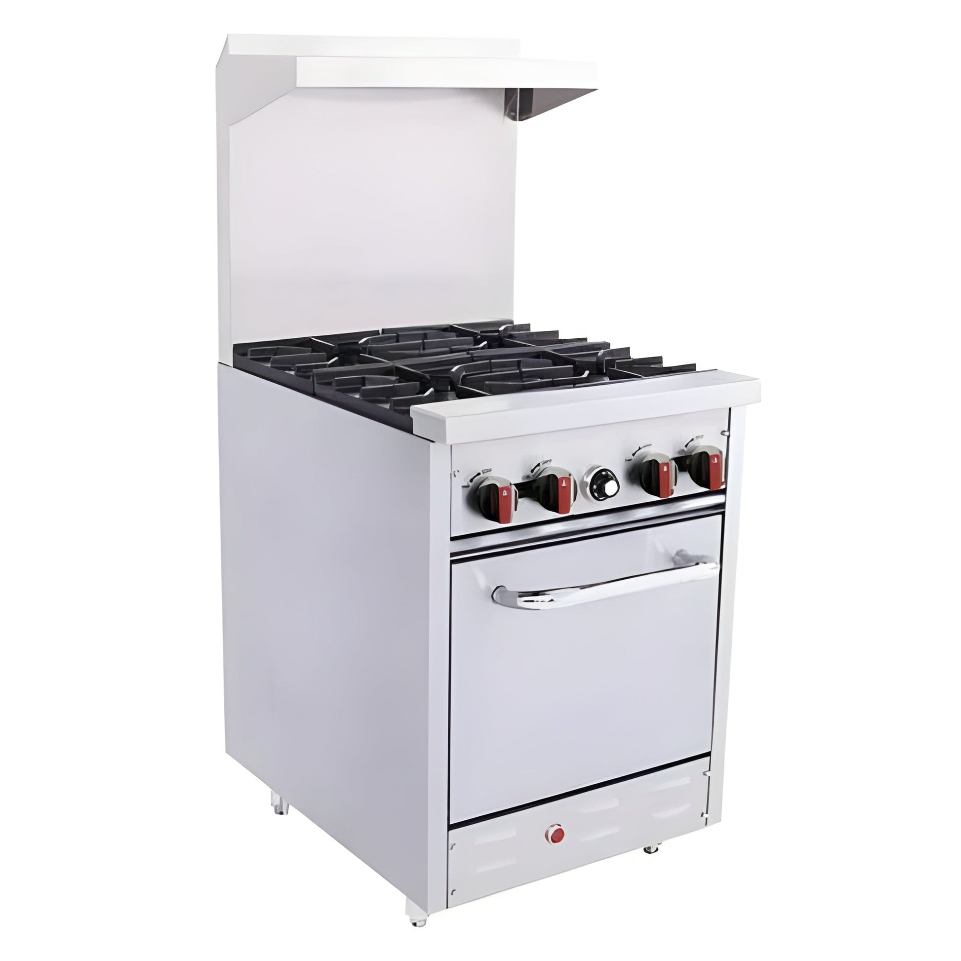 Restaurant Series Range, Natural gas, 24", (4) 30,000 BTU open cast iron burners, 12" x 12" removable cast iron grates, (1) space saver oven, (1) chrome oven rack, 6" plate rail, 2-piece back guard & shelf, stainless steel front & sides, 6" stainless steel legs with adjustable feet, 150,000 BTU.
