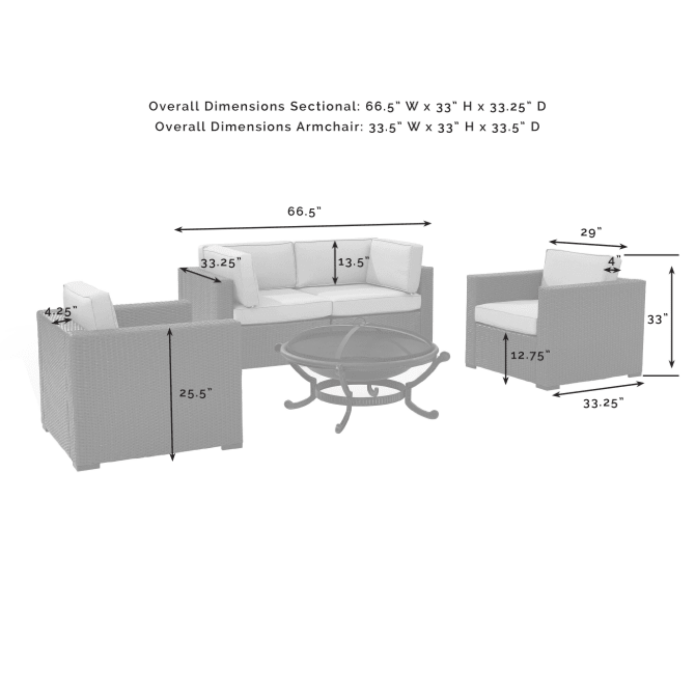 Relax fireside with the Biscayne 5pc Conversation Set. The loveseat and armchairs have durable powder-coated steel frames covered in beautiful all-weather resin wicker. Each seat is topped with lush dyed yarn polyester cushion covers, designed to provide comfort and withstand the elements. Nestled at the center of the set is a charming fire bowl made from sturdy steel that offers hours of warmth on cool nights. Craft your own personal backyard hideaway with the Biscayne Conversation Set.