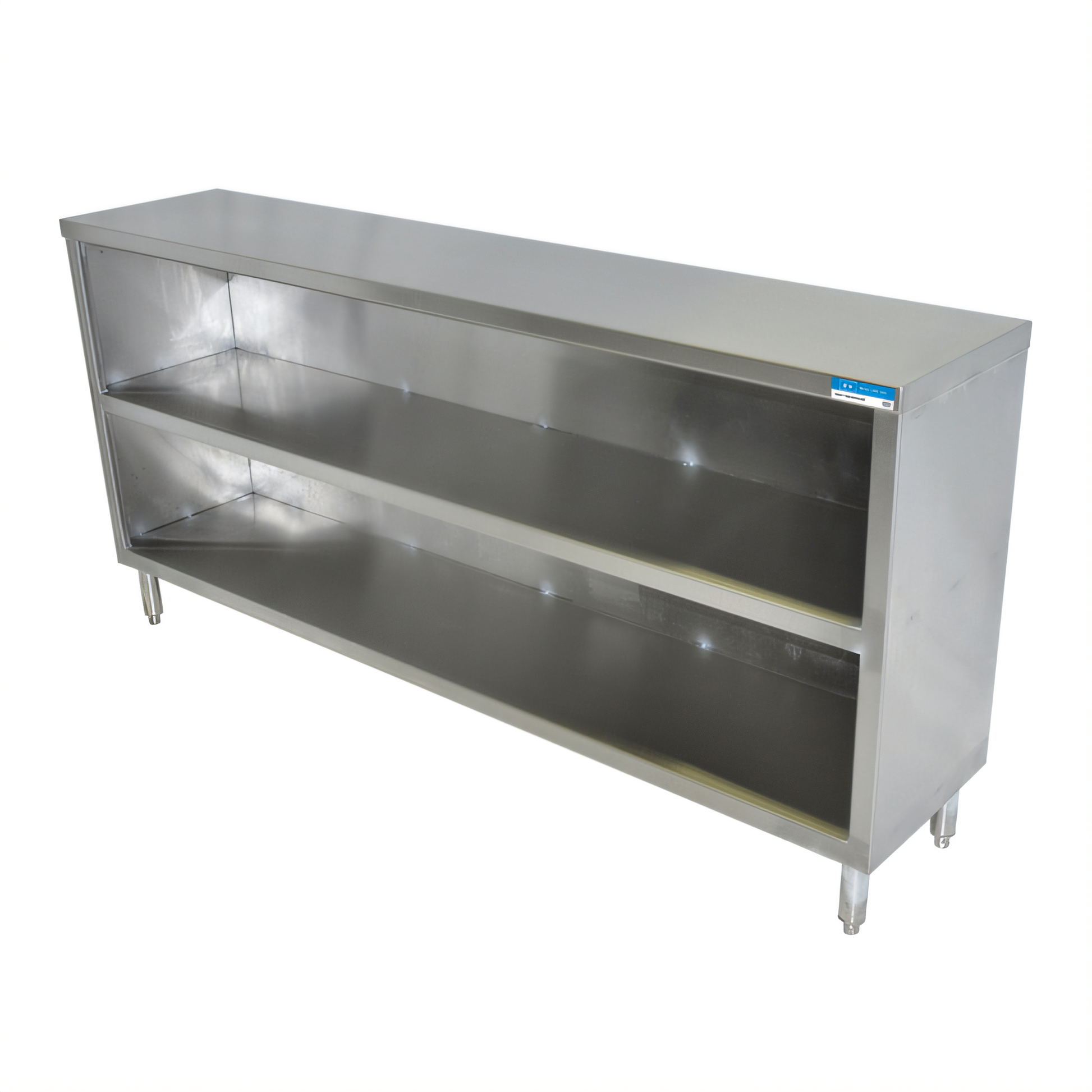 BK Resources BKDC-1536 stainless steel open-front dish cabinet, 36"x15", fixed shelf, adjustable legs, NSF certified for durable, sanitary kitchen storage.