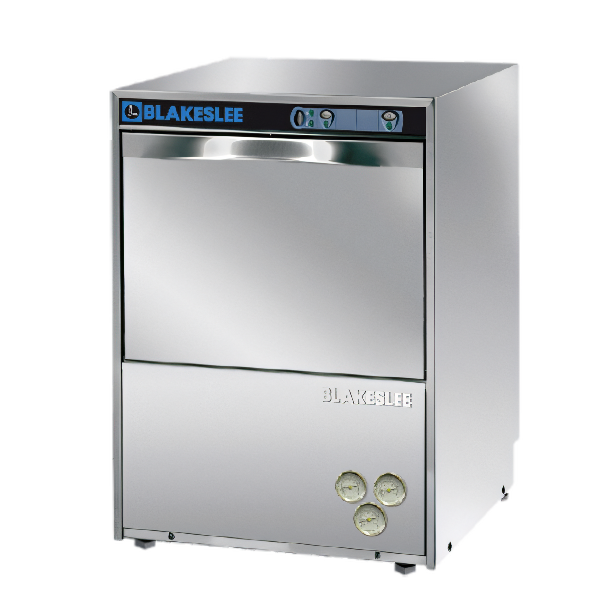 Blakeslee UC-18-1 undercounter dishwasher: 23.5" stainless, 30 racks/hr, 180°F sanitizing, built-in dispensers, triple filter, 20"x20" rack.