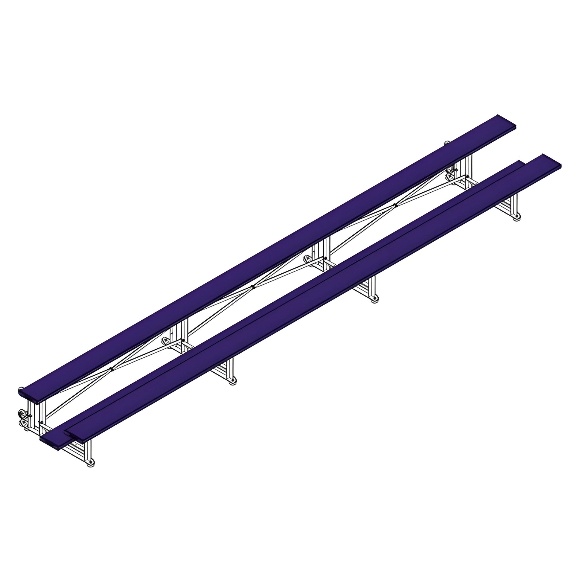 A: These 27' tip & roll bleachers feature a 2-row single-foot plank design with a durable aluminum frame and a "tip & roll" feature for easy mobility and storage.