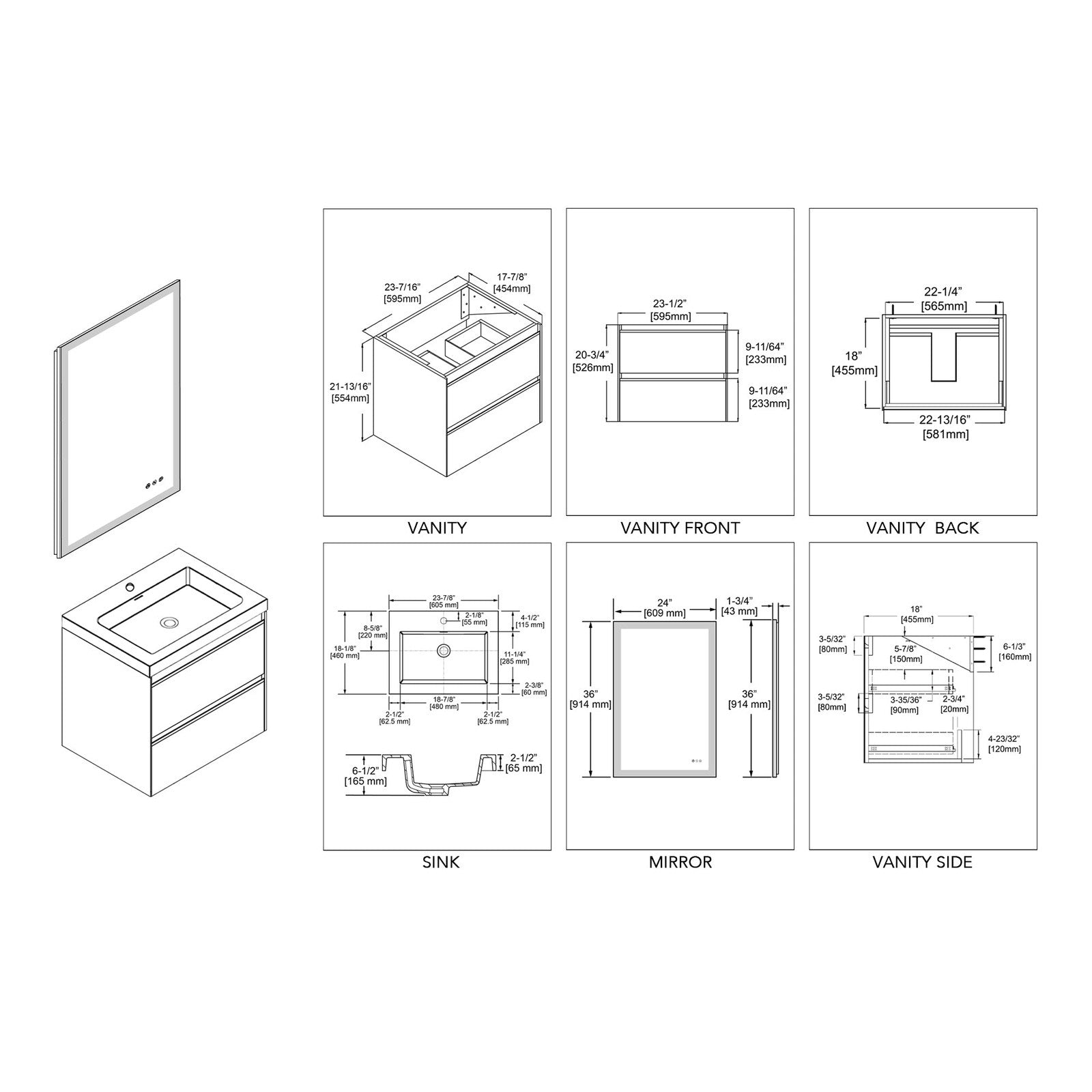 A: A compact, modern 24″ wall-mounted or legs-supported vanity with a high-gloss two-tone finish (white drawer fronts, grey cabinet box).