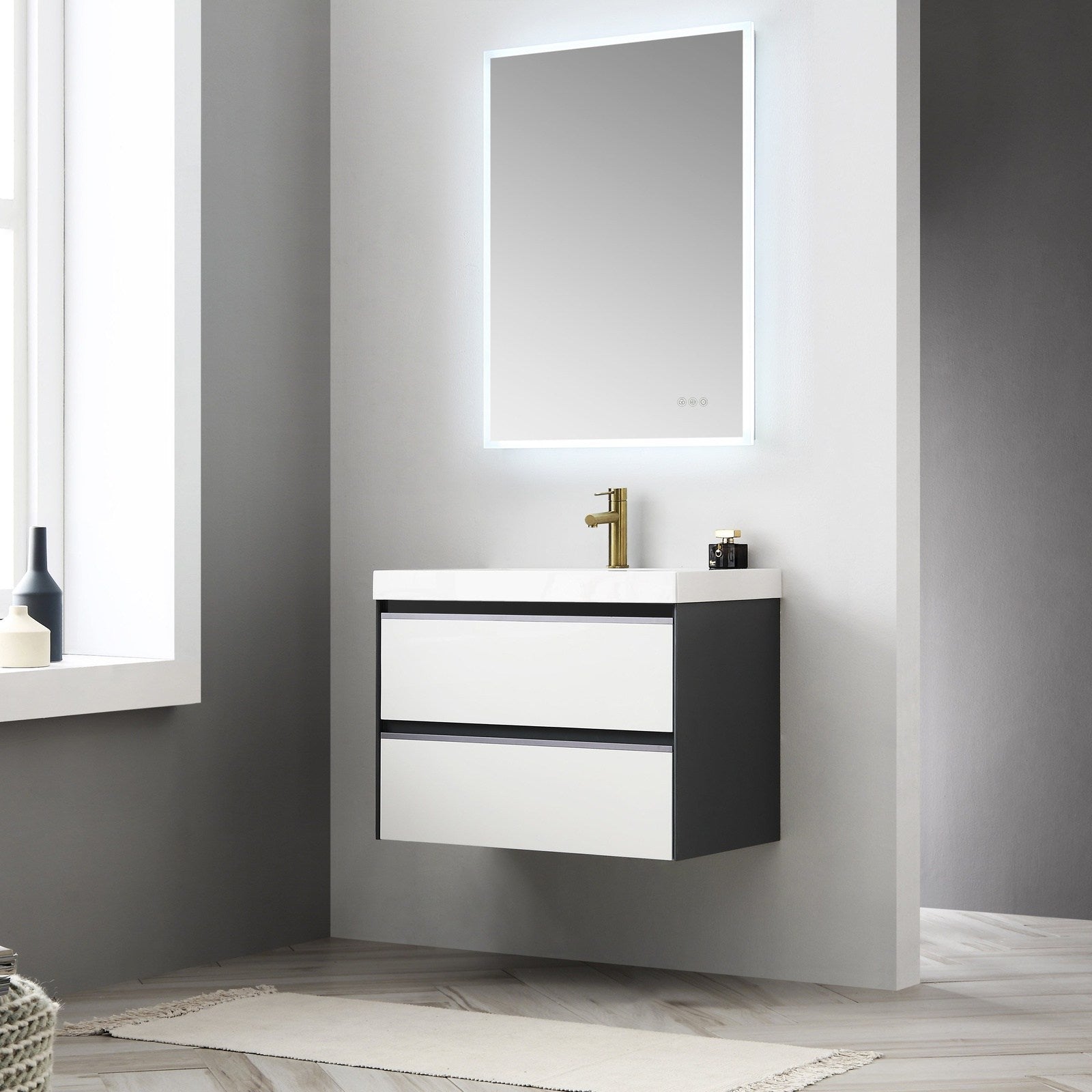 A: A sleek, modern 30″ wall-mounted or floating vanity with a high-gloss two-tone finish (white front, grey box) designed for contemporary bathrooms.