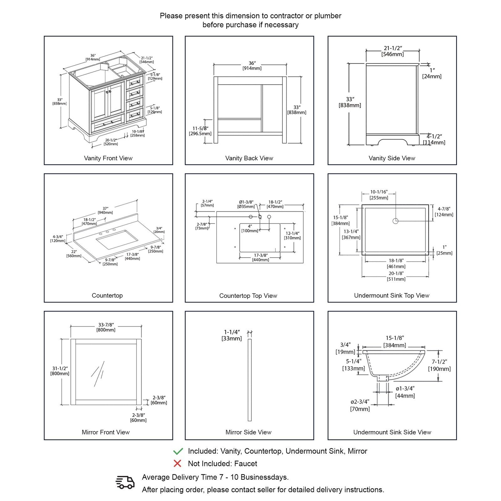 - Vanity: 36″ W x 21-1/2″ D x 33″ H