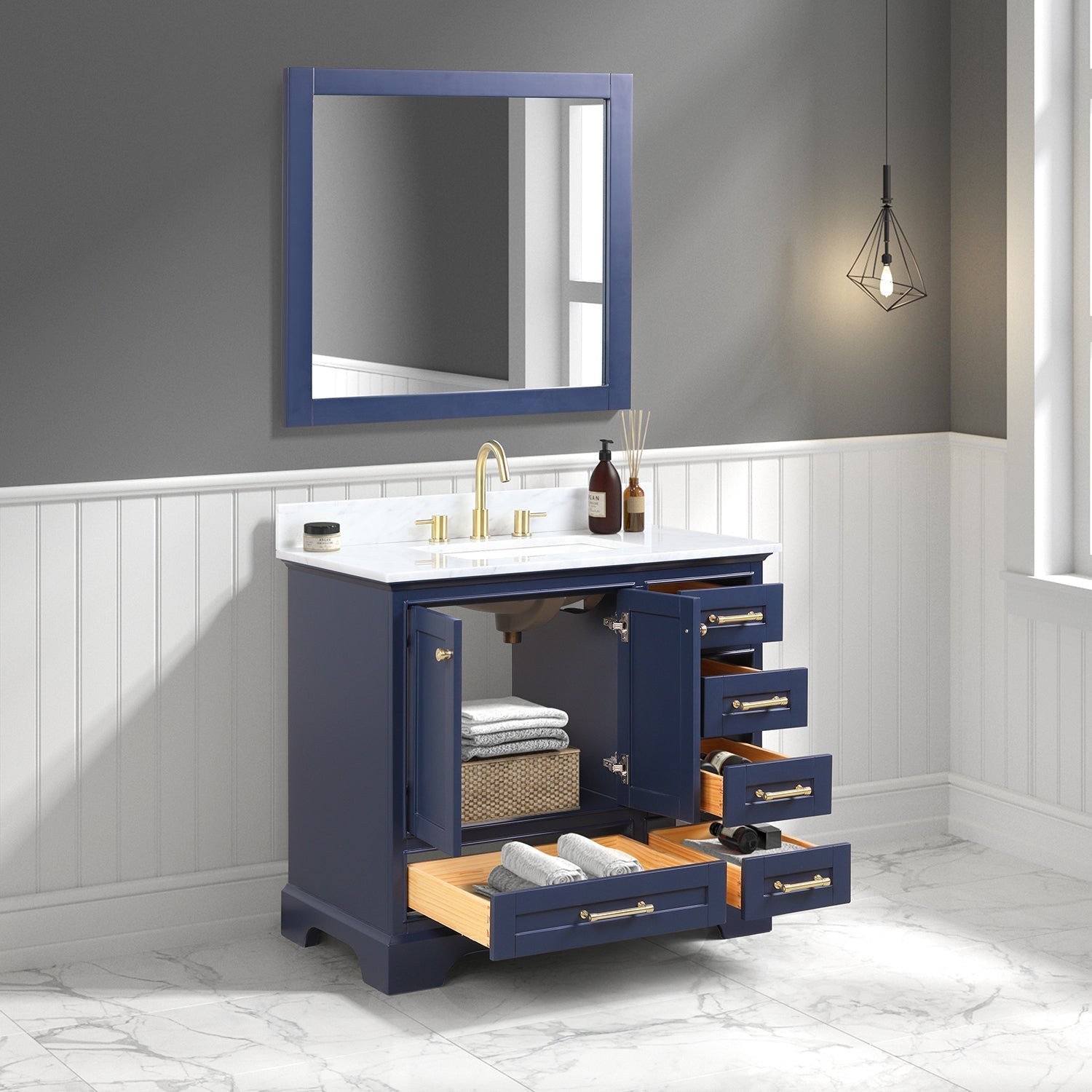 A: A high-quality 36″ freestanding vanity with solid wood construction, elegant design, and soft-closing hardware.