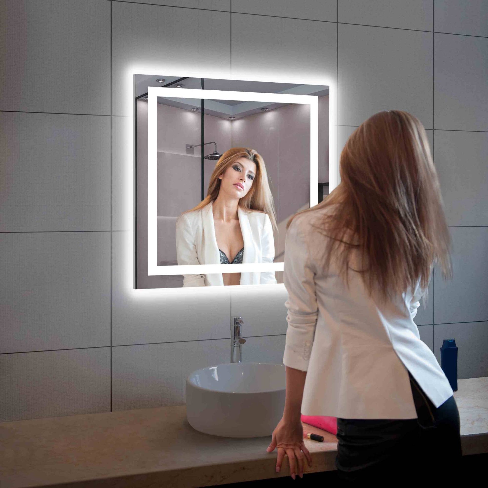 A: A square 30″ × 30″ LED-lit vanity mirror with built-in defogger and smart lighting control.