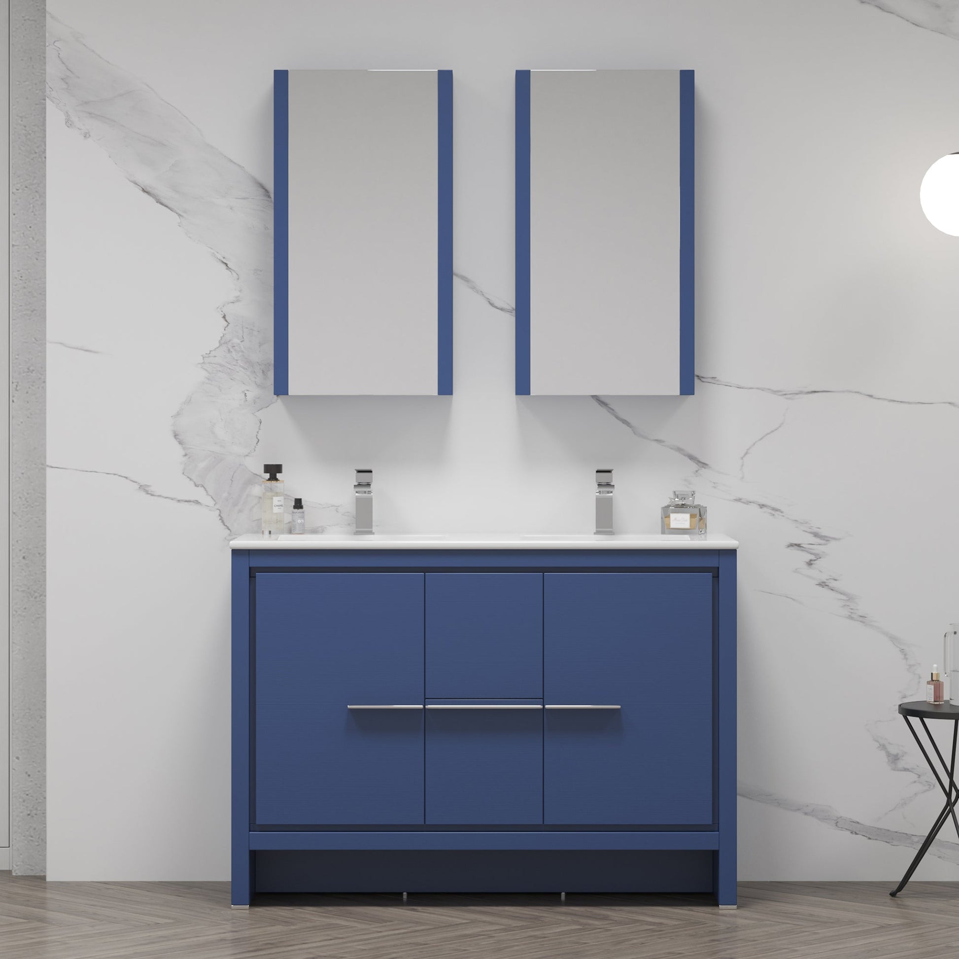 A: Provides ample storage, modern styling, durable construction, and compatibility with double basins and matching Blossom mirrors or medicine cabinets.