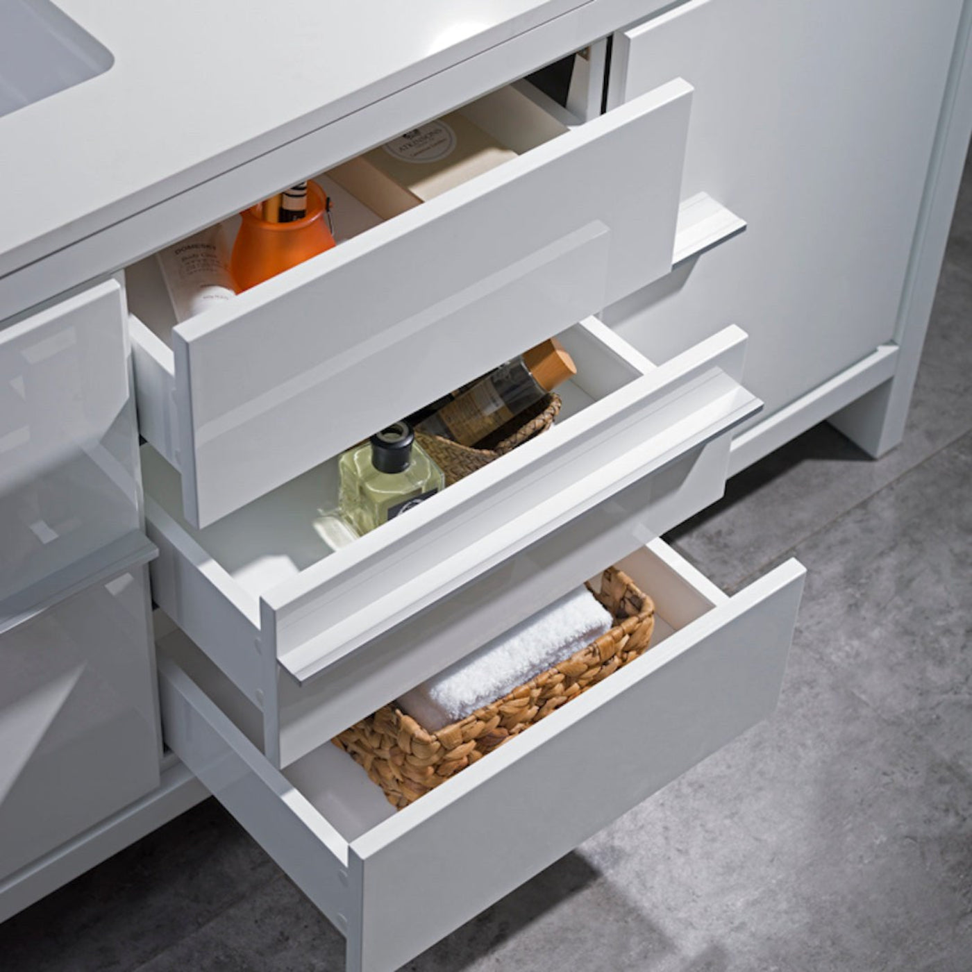 A: Multiple drawers and cabinets for organized storage of toiletries and bathroom essentials.