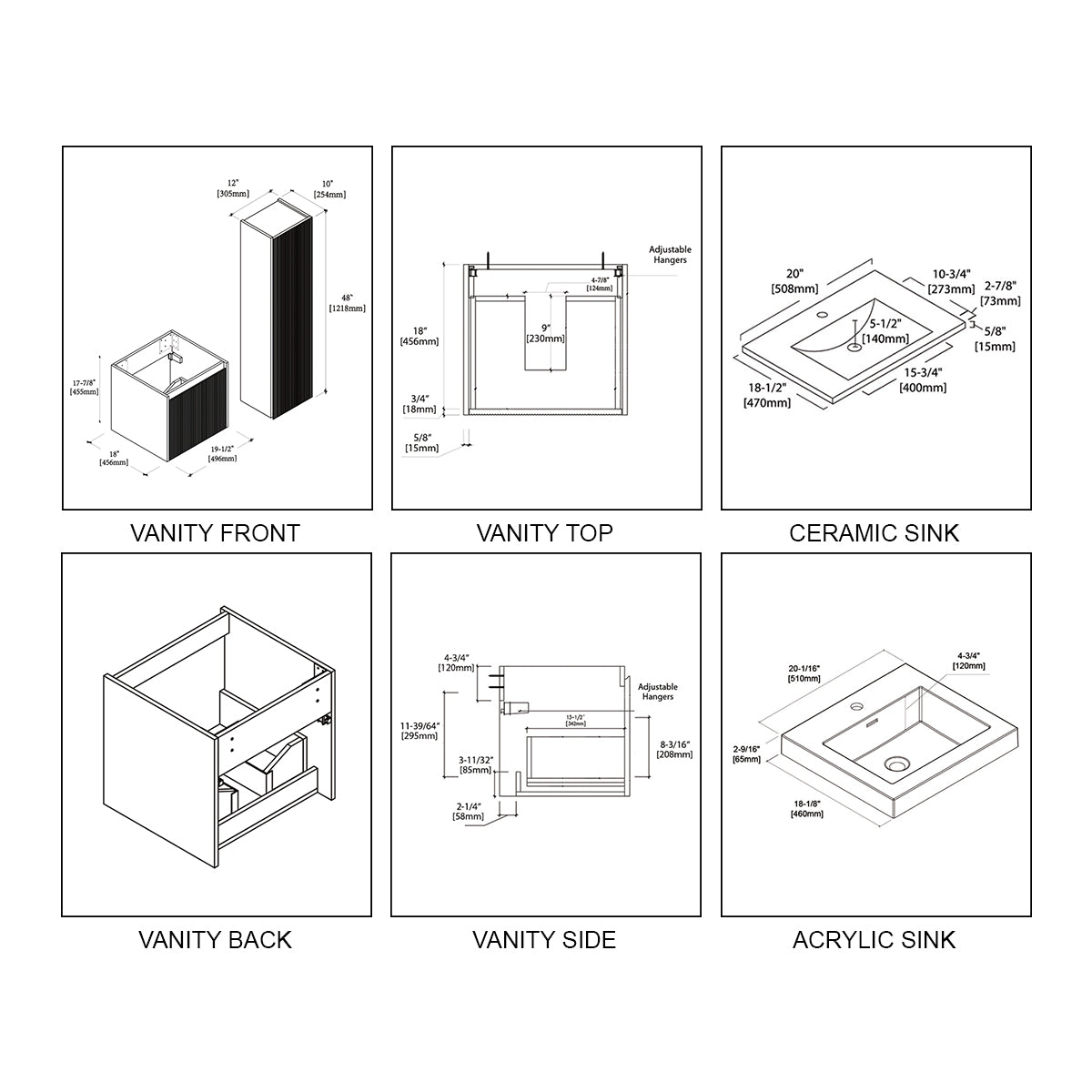 • Vanity: 19-1/2″ W x 18″ D x 17-7/8″ H