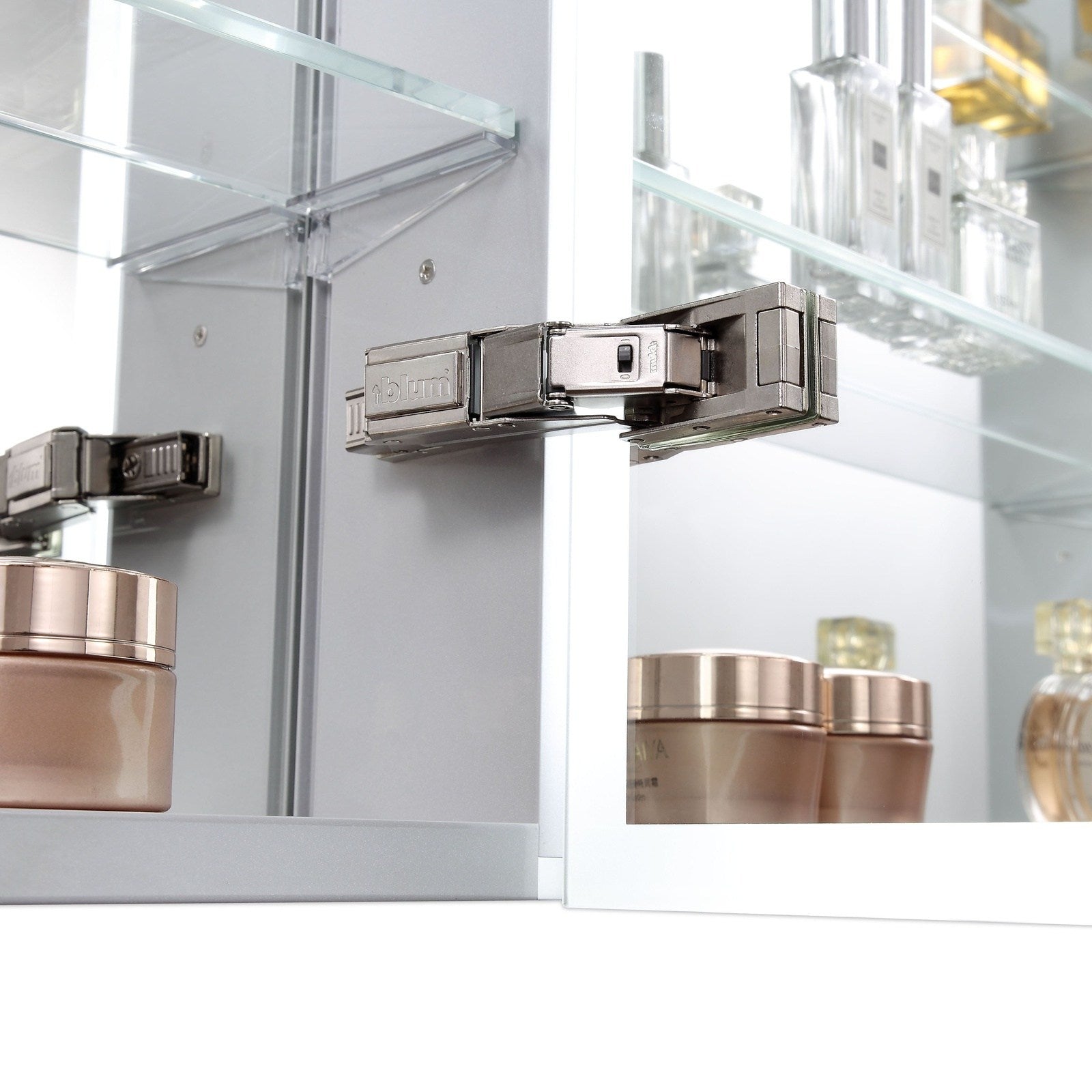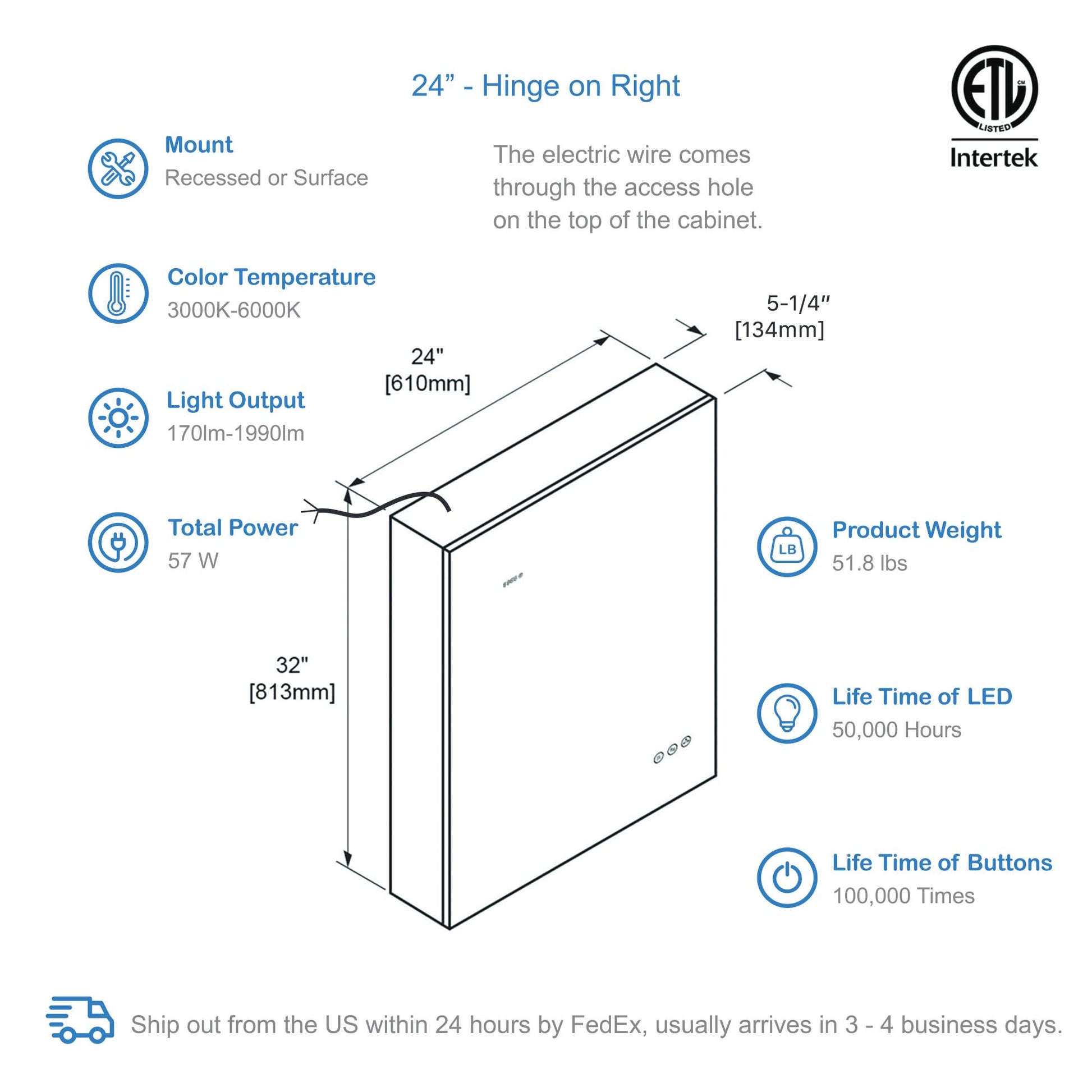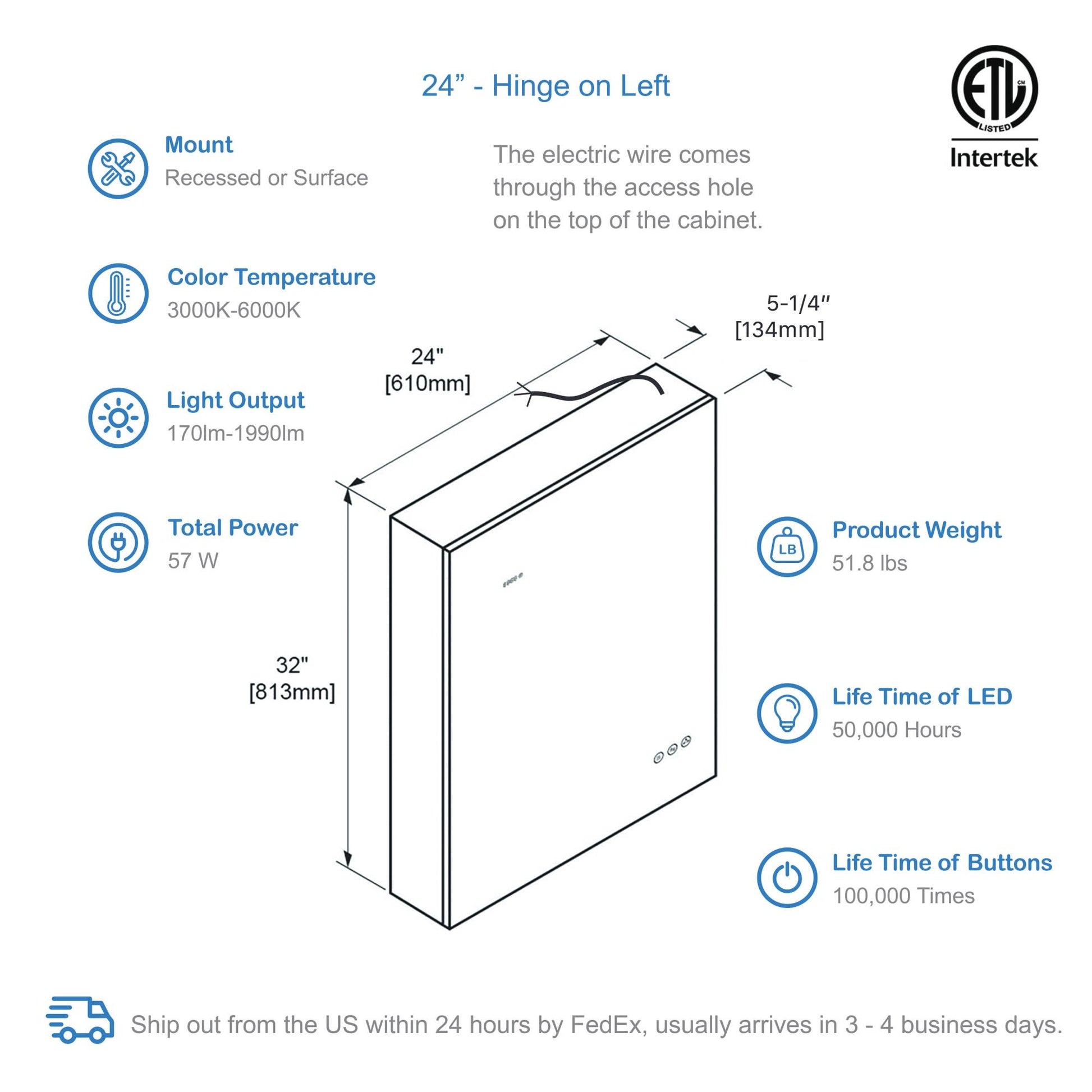 Smart LED Lighting: The Blossom Sirius 24″ LED Medicine Cabinet (MCL3 2432L) features soft-touch controls for on/off, dimming (5%–100%), and color-temperature adjustment from 2,500K to 6,000K.