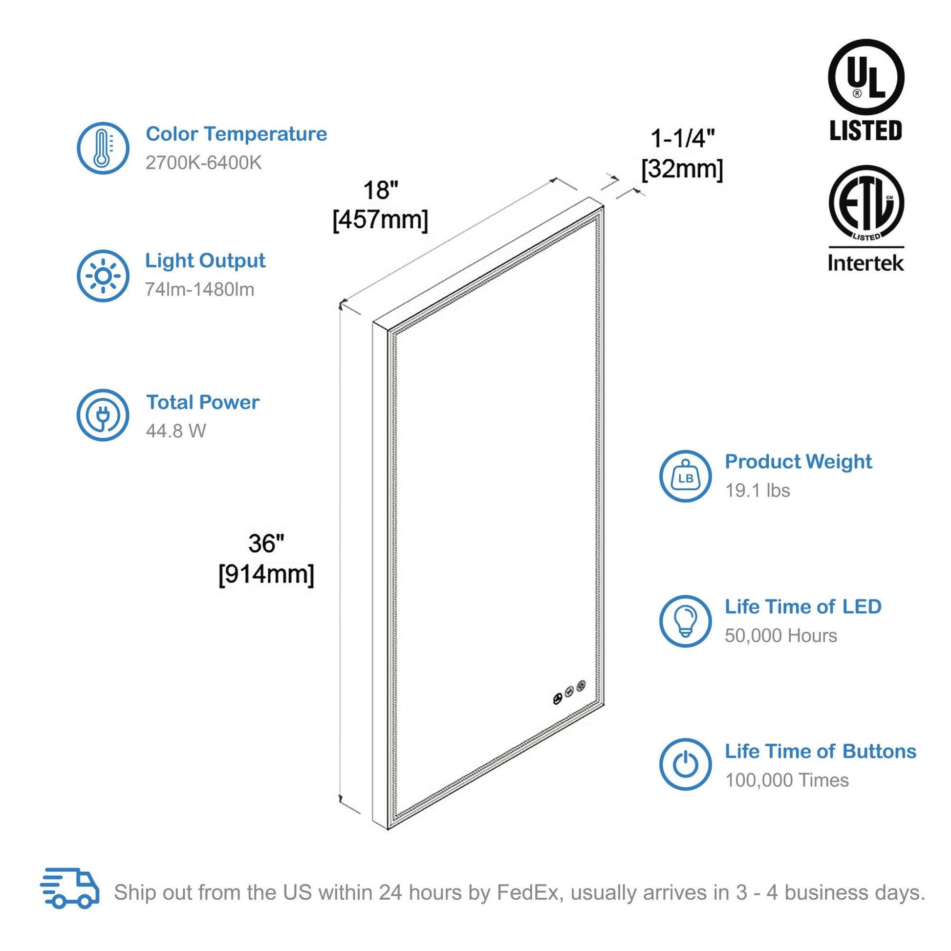 Customizable Lighting: The Blossom Stellar 18β³ LED Mirror (LED M4 1836 MB) offers touch controls for on/off, dimming from 5%β100%, and full color-temperature adjustment from warm 2700K to cool 6400K.