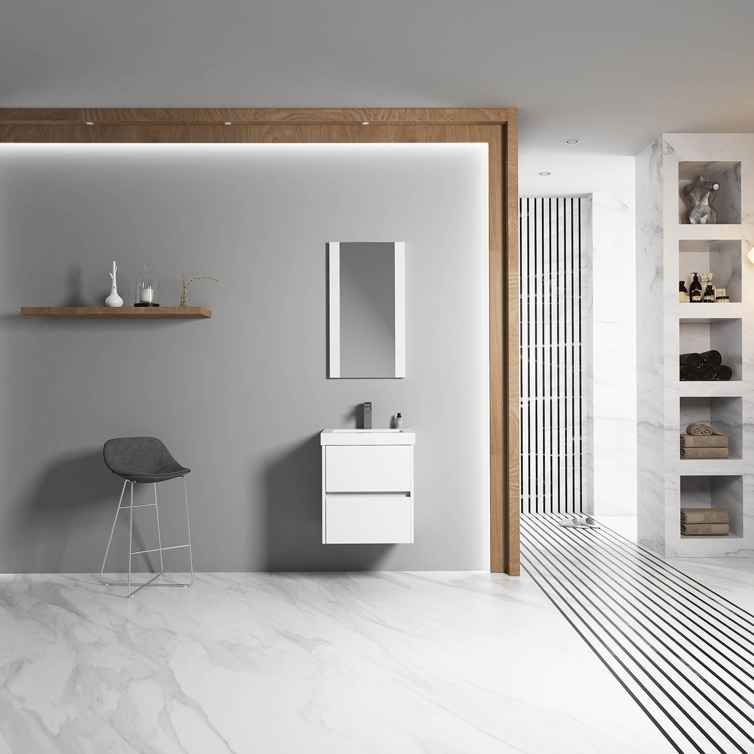 A: Combines space-efficient design, soft-close storage, and a durable glossy finish — perfect for modern small bathrooms.