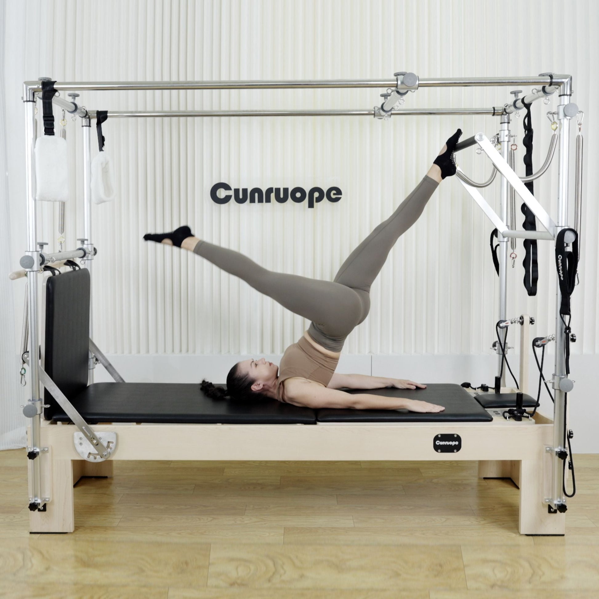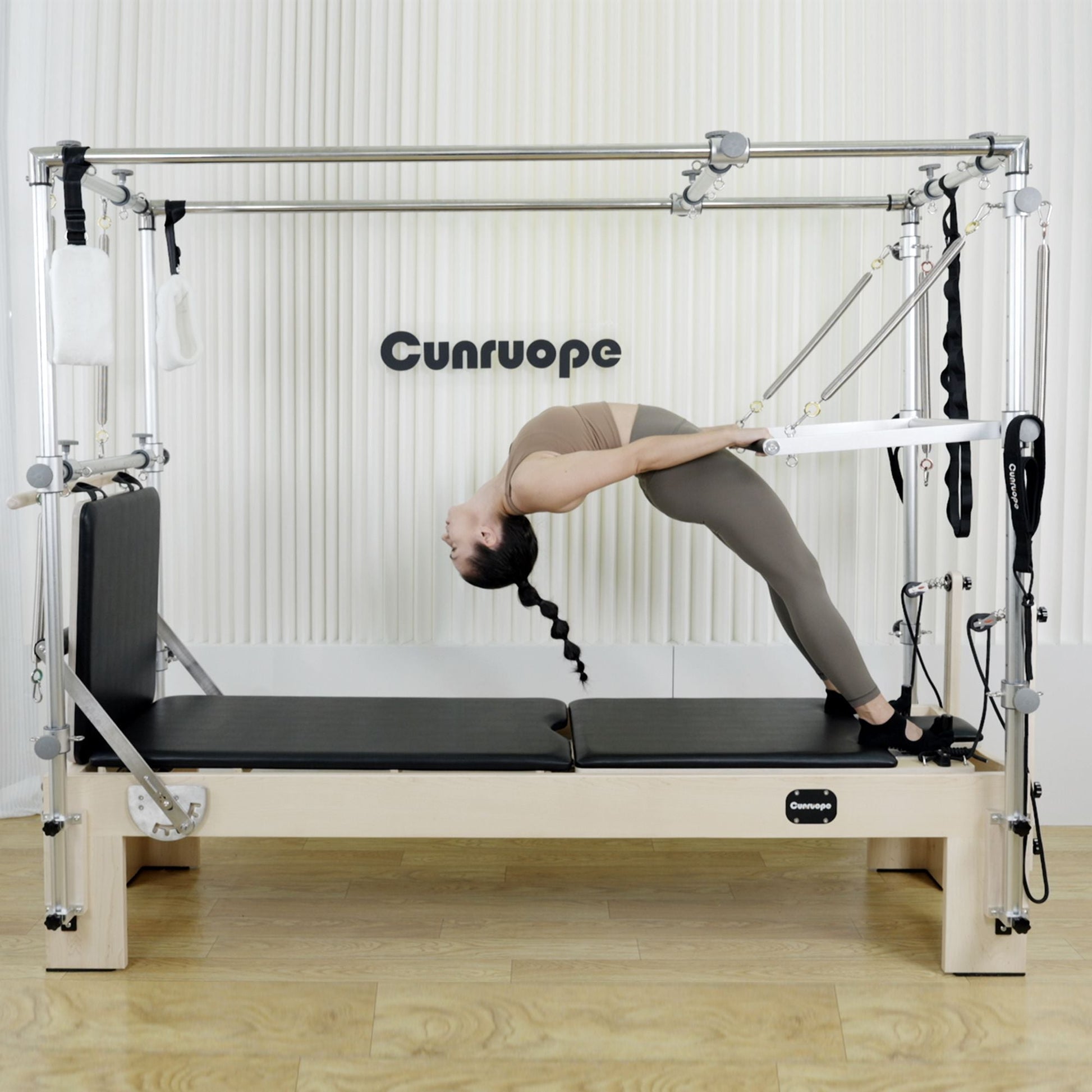 A: It includes a solid wood frame, adjustable springs for resistance training, a cushioned carriage, a push-through bar, trapeze, and multiple attachment points for versatile exercises.
